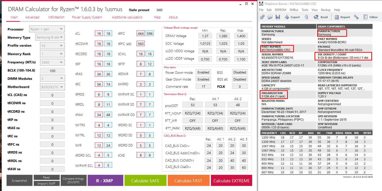 Небольшой вопрос по разгону оперативки. У меня память и близко не берет тайминги, подсчитанные Dram Calculator for Ryzen. Делаю на мой взгляд по инструкции. Не то что бы меня это сильно волновало. Свои 3400 она взяла, пусть и на больших таймингах, но меня это устраивает, но вдруг если сталкивался кто скажешь, что я делаю неправильно Здесь тайминги в синей рамке - мои текущие. В красной - подсчитанные калькулятором в SAFE режиме. проц 2600 рейзен мать--b350m bazooka