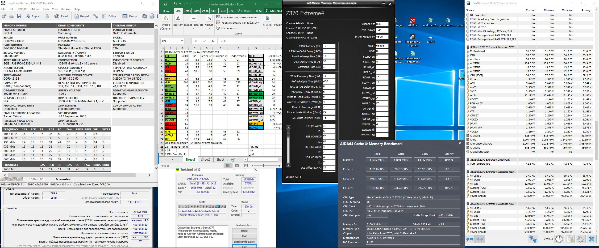 Друзья! Буду рад совету. Что нужно поправить/ улучшить? Из того,что уже опробовано: - tRRD_L = 6 стартует только при условии, если tRRD_S =4 или 6. Есть подозрение, что по факту система применяет иные значения tRRD_L и tRRD_S. При таких значениях неверно тренируется блок RTL/IOL. Если устанавливает корректно RTL/IOL, то в мемтест ошибки. Игры фризят. - tRRD_L = 4 - система не стартует (даже при tRRD_S =4). - tWTR_L/ tWTR_S - уже установлены минимально возможные значения, с которыми система стартует (см.скрин). Значения данных таймингов устанавливаю через tWRRD_sg/tWRRD_sg. - tRTP/tWR - уже установлены минимально возможные значения, с которыми система стартует (см.скрин). В принципе, система работает и со значениями tRTP-8/tWR-16. - tRFC - очень стремный тайминг. Не понятно на что влияет. Ниже 400 система не стартует. Более того, ставить любые рандомные значения система на частотах 4200 и более не дает. Заметил что хорошо принимает значения кратные 8. Такие как 400, 496, 560. С не кратными значениями (между теми, что указал ранее) система может даже не стартовать. При увеличении напряжения и снижении частоты (4100/4000), дает установить tRFC практически любое значение от 320. - tFAW - при данном значении система наиболее стабильна (см.скрин). При таком значении tFAW, блок RTL/IOL всегда тренируется правильно, а также дает снизить tRFC до 400. Значение tFAW = 16 дает поставить при tRRD_S =4 и tRRD_L = 6, но какие значения (tFAW/tRRD_S/tRRD_L) применяются системой по факту трудно сказать, т.к. при таких значениях трудно натренить блок RTL/IOL. Если удалось натренить, то в мемтест ошибки. - tCWL - установлено 15, т.к. с четными значениями система оч. плохо работает/не работает. Со значением 16 может даже не стартовать. Если tCWL оставлять авто, система автоматически устанавливает значения 13,15,17, в зависимости от частоты работы памяти. - tCKE - значение 8 система ставит в режиме авто. Можно поставить 7, но система не всегда стартует с таким значением + трудно натренить блок RTL/IOL. - tRDRD_sg/tWRWR_sg установлены значения 7. Со значениями 6 система не стартует. - tRDRD_dg/tWRWR_dg установлены значения 4. Значения меньше не пробовал. Есть подозрение, что система не запустится. - tRDWR_sg/ tRDWR_dg установлены значения 13. Система неплохо работает со значениями 12. Со значением 11 система не стартует. - tWRRD_sg/tWRRD_sg = 29/25 - минимальные значения, при которых есть старт системы.