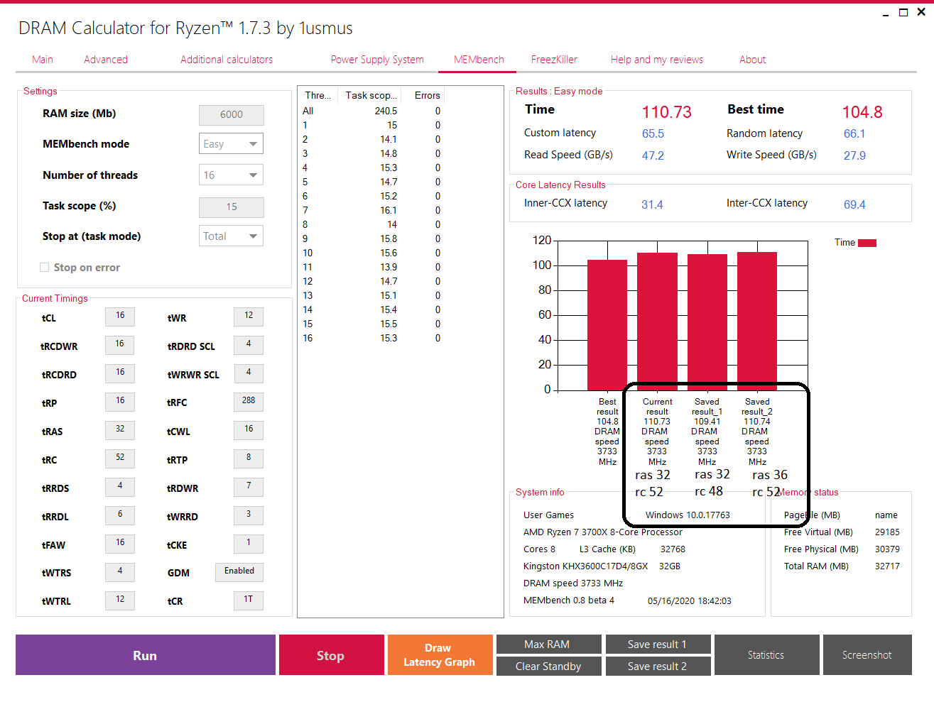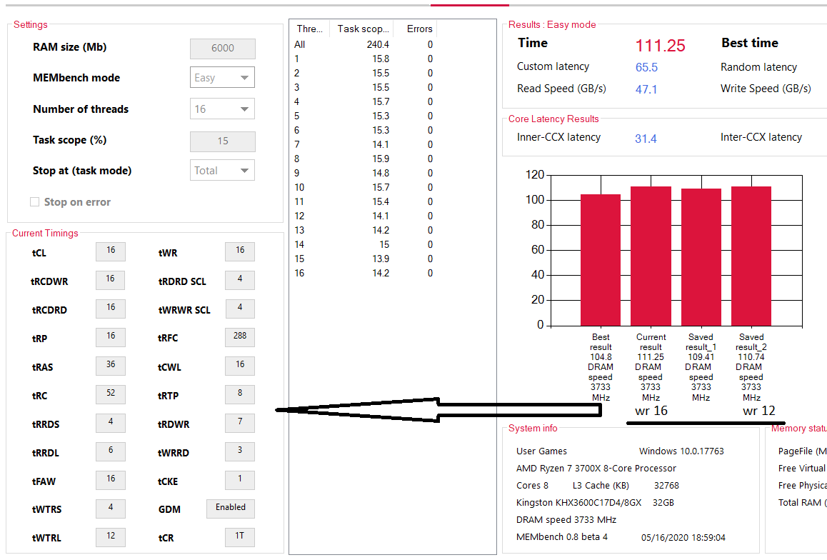 да но! частоты в 3733 я бы избегал (3600 или 3800) учитывая tRFC, чипы у тебя бидай. не вижу проблемы взять 3800 (тебе FCLK дороже) ну и там где у тебя пятёрки и семёрки стоят - семёрки я еще могу там понять (они в теории там могут быть, но скорее всего шестёрки будут работать), но пятёрок там быть не может вообще (до 3800мгц включительно) т.е. смело вместо всех пятёрок ставь четвёрки
