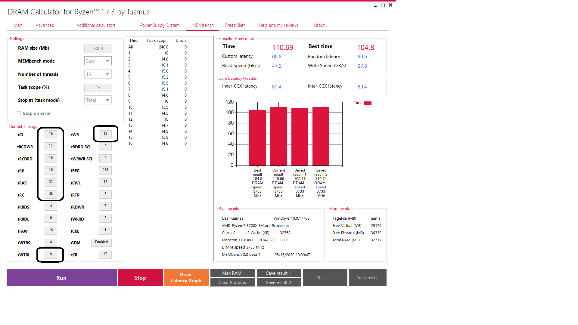 ты просто возьми мои тайминги для 3333-3400мгц из шапки (там ссылка) вопросы вызывает только WR возможно тебе придётся повысить wtr_l до 12 и тогда WR до 16, а RTP соответственно до 8 ну и плата у тебя ... такое 2.52в на VPP вместо 2.5 и полетишь но сначала пробуй без этого штриха