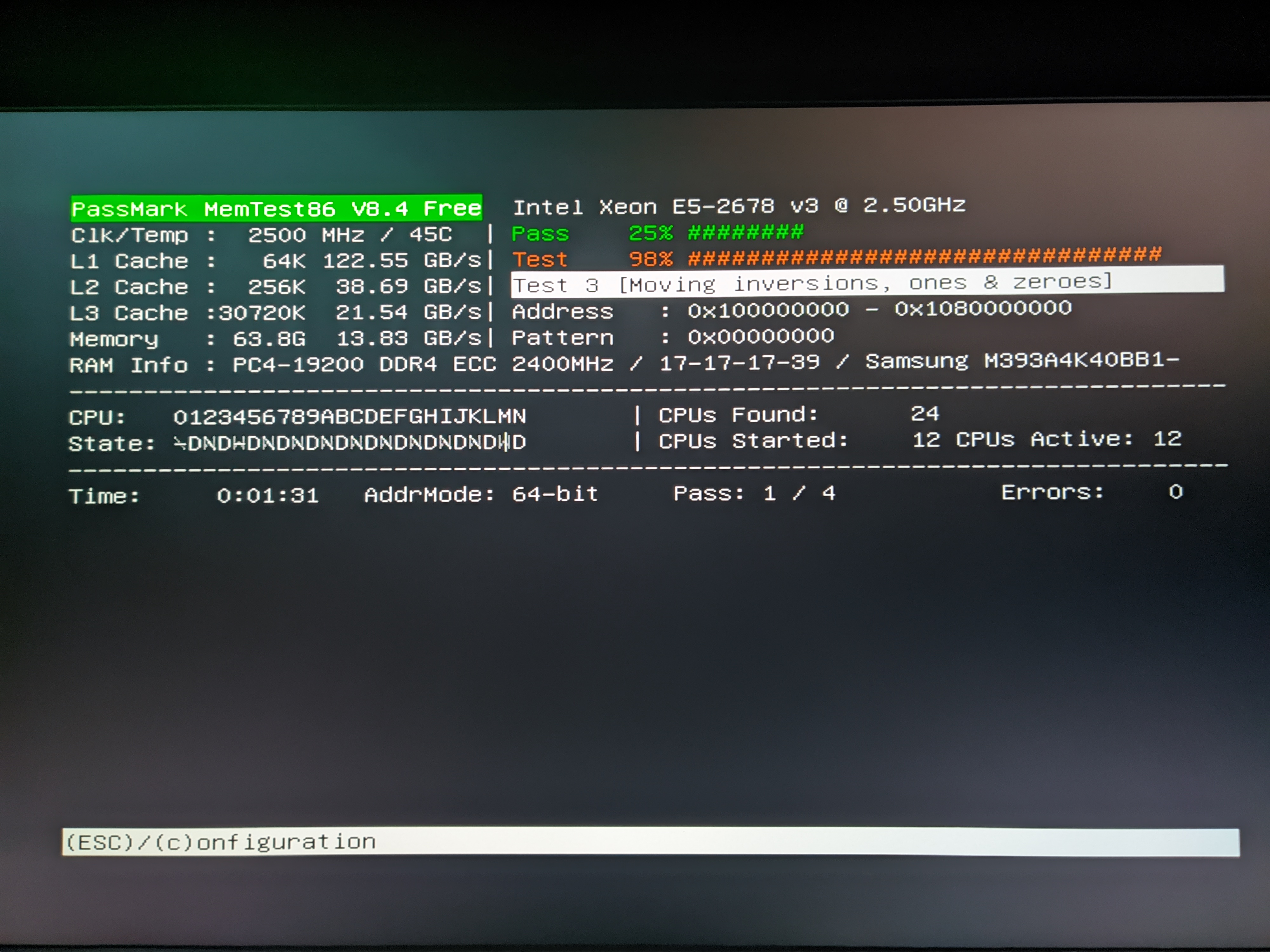 Здравствуйте! Кто может померить скорость передачи данных памяти DDR4 2133МГц в двухканальном режиме с Xeon E5-2678 v3 или похожим, конкретно в тесте PassMark MemTest86, сообщите пожалуйста результат! Тестировал 2x32Гб/4ранга память. Работает в двухканальном режиме. Кроме MemTest86, проверить, особо, нечем - нет Windows с CPU-Z и AIDA-64. Memtest86 (который без плюса, именно ПассМарк) показывает 13.24..13.26ГБ/с, что мало, по сравнению с публикуемыми замерами AIDA-64.