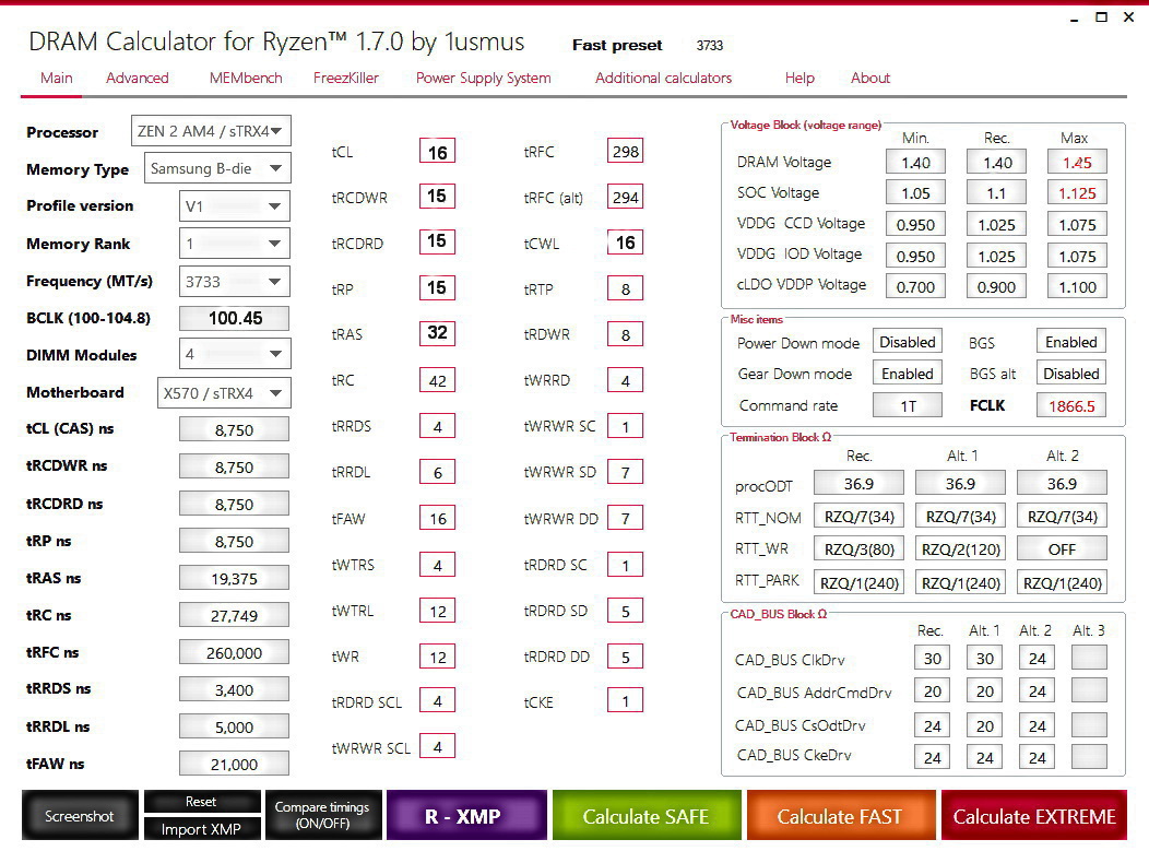 Все тайминги строго по калькулятору для E-die 3533 FAST, только напряжение на памяти чуть поднять пришлось, до 1.375V. SOC = 1.1V. С новым процом надеюсь, возьму 3733 или 3800