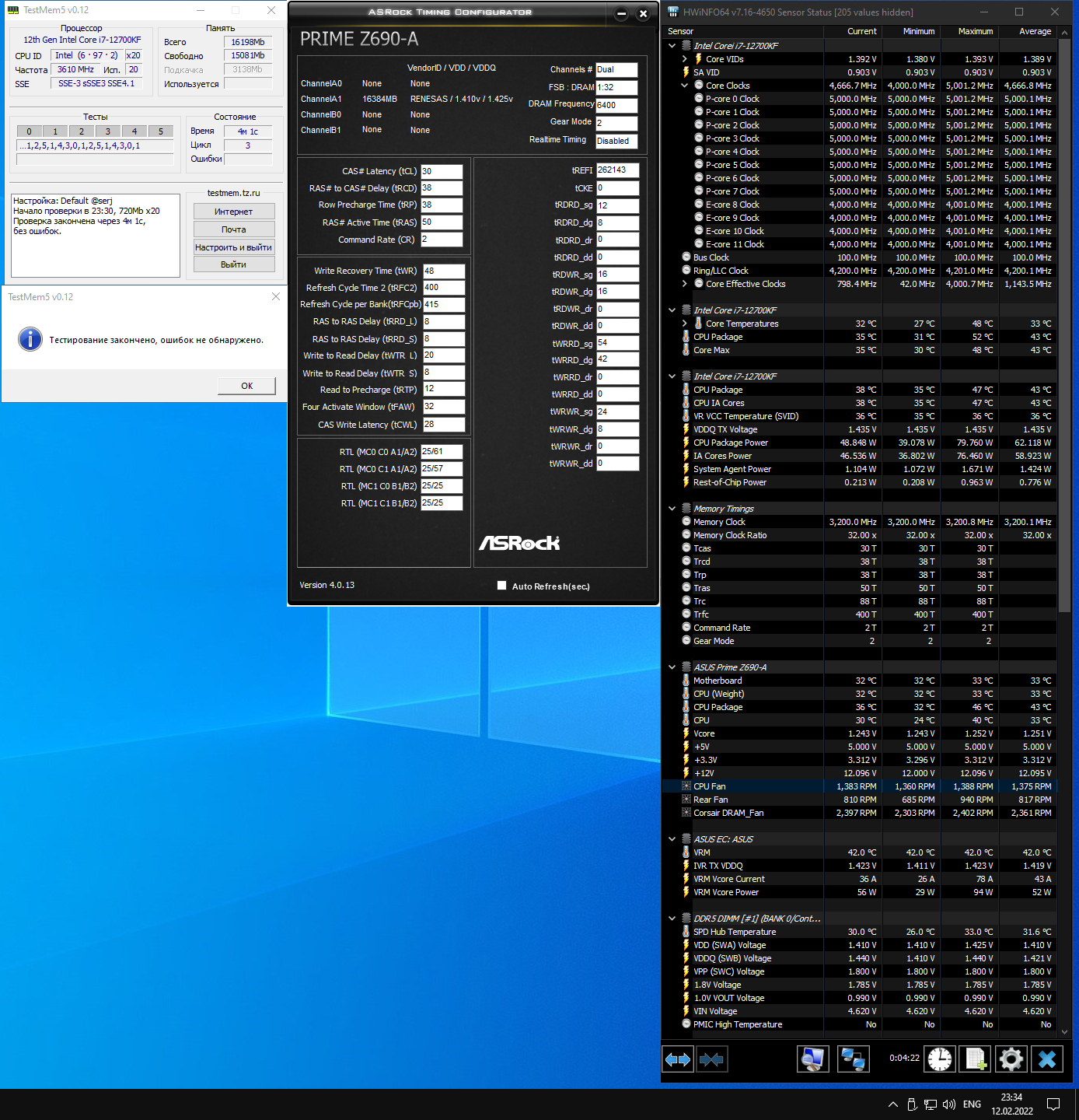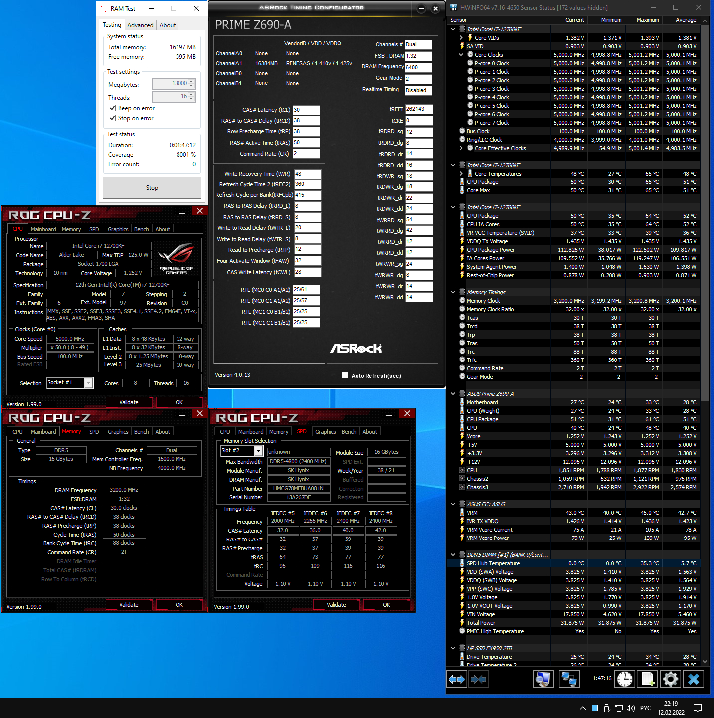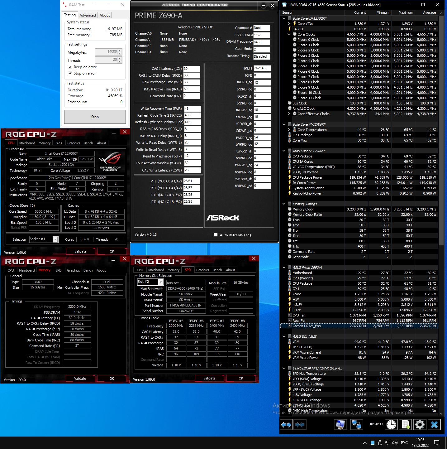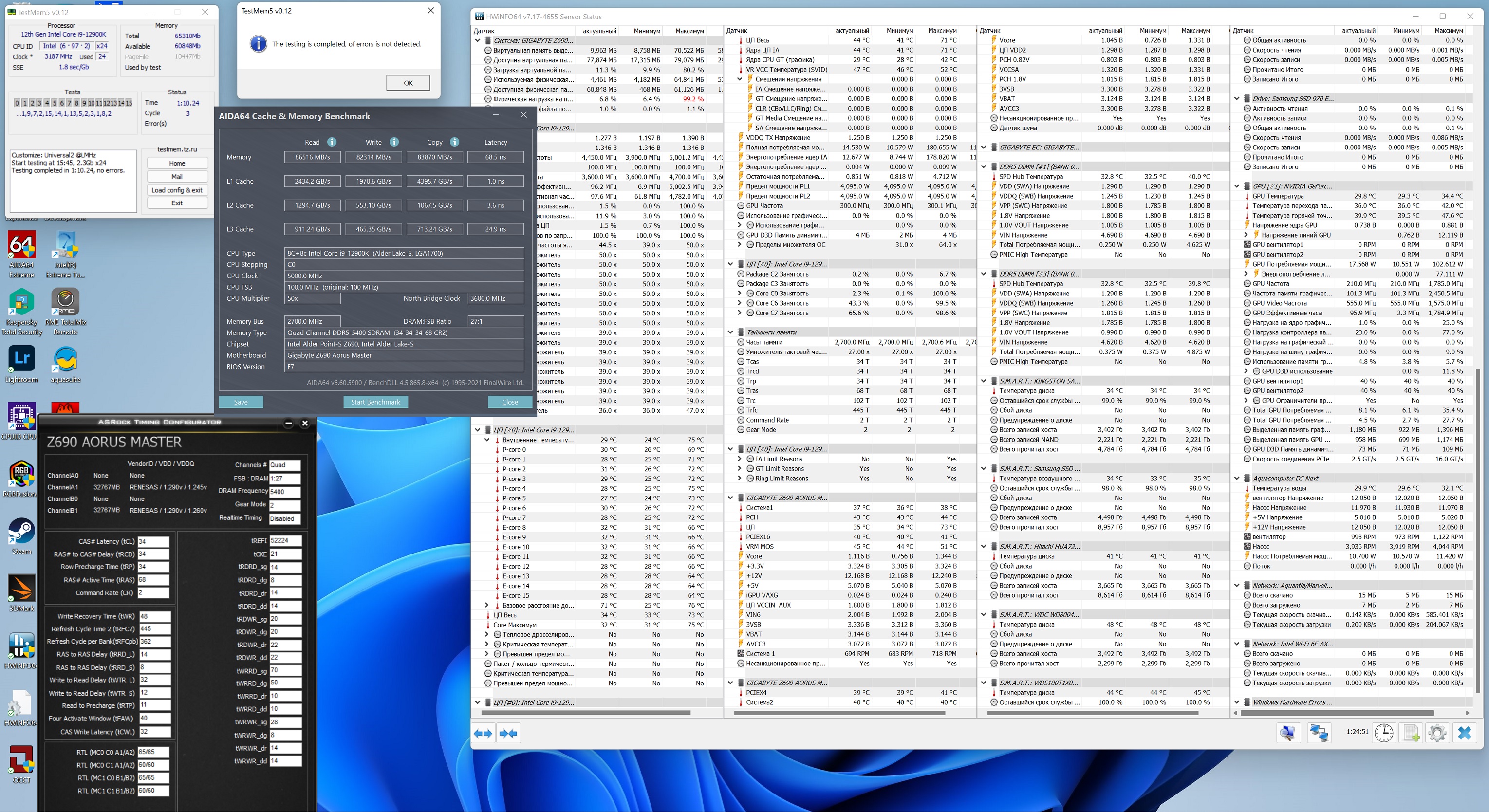 В общем пока только такие результаты на Master Z690 и 2 * 32Gb Hynix. Зато стабильно Запускается даже на 5800 со стоковым напряжением 1.1В, но на этой частоте вообще о какой-то стабильности в принципе говорить не приходится. На 5600 периодические ошибки.