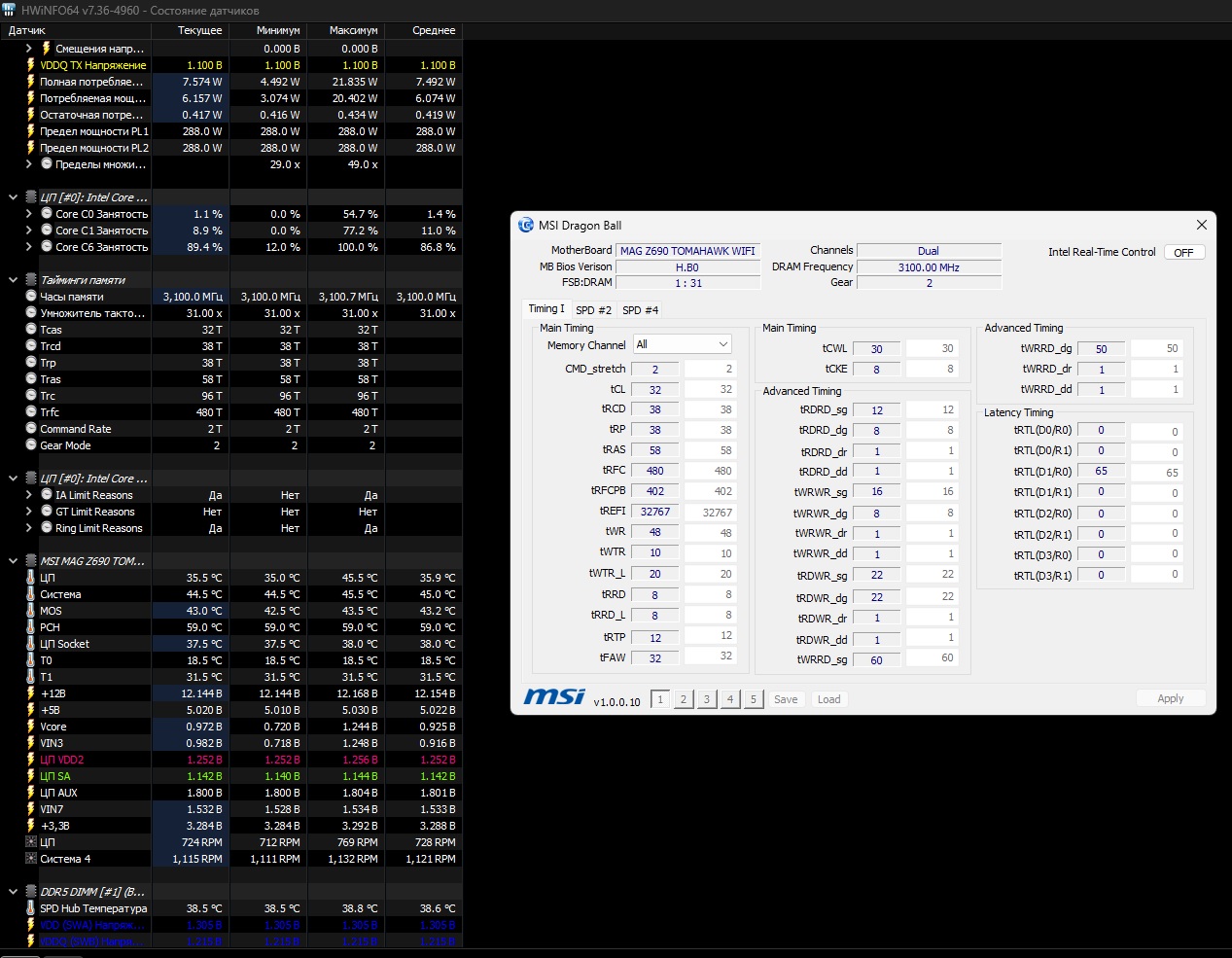 Плата: MAG Z690 TOMAHAWK WIFI, плашки KF556C40BBK2-32. Проц у меня в стоке.