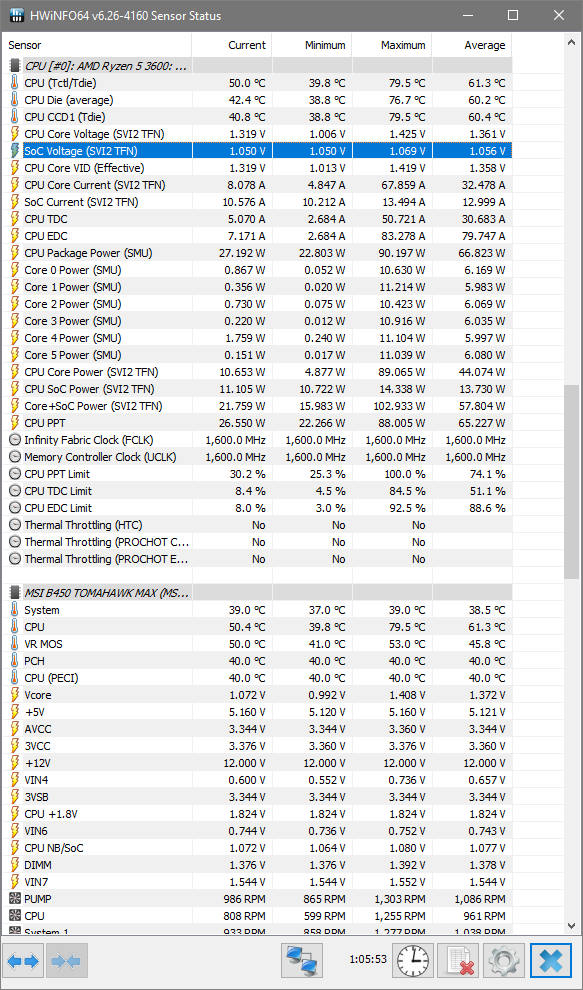 Soc не просел ниже 1.05. Напряжение на памяти 1.36, но плата стабильно его повышает. Спонтанных выключений пока нет, в целом по мониторингу вышло вот так: