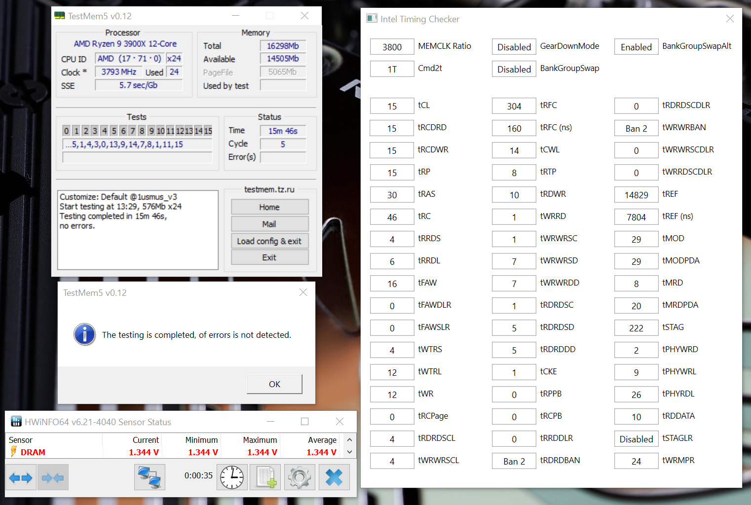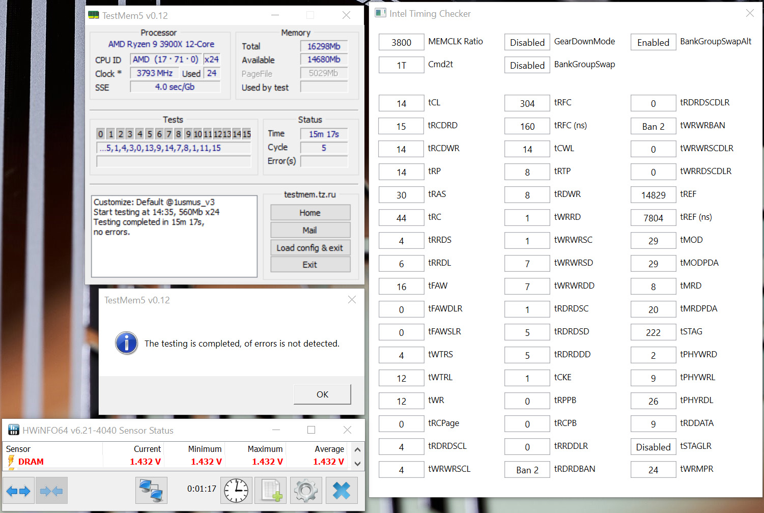 Добрый день. Коллеги, все тесты проходит. Кроме 20 циклов конфига от Anta777. В конце появляется 1-2 ошибки. Я полагаю из за перегрева. Прошу вас показать или указать на ошибки в текущих таймингах. 32гб 2 плашки А2 B2. Текущие тайминги работают без ошибок (за исключением после прогрева указанного выше) прайм95 час, линпак 20 циклов, все без ошибок. Спасибо заранее за помощь, если нужны еще доп.данные пишите какие - скину. P.S. xyligano очень хотелось бы получить комментарии по моему случаю и от тебя тоже. Мне нравится как ты рассуждаешь, а также запас информационных знаний по тематике. Молодец.