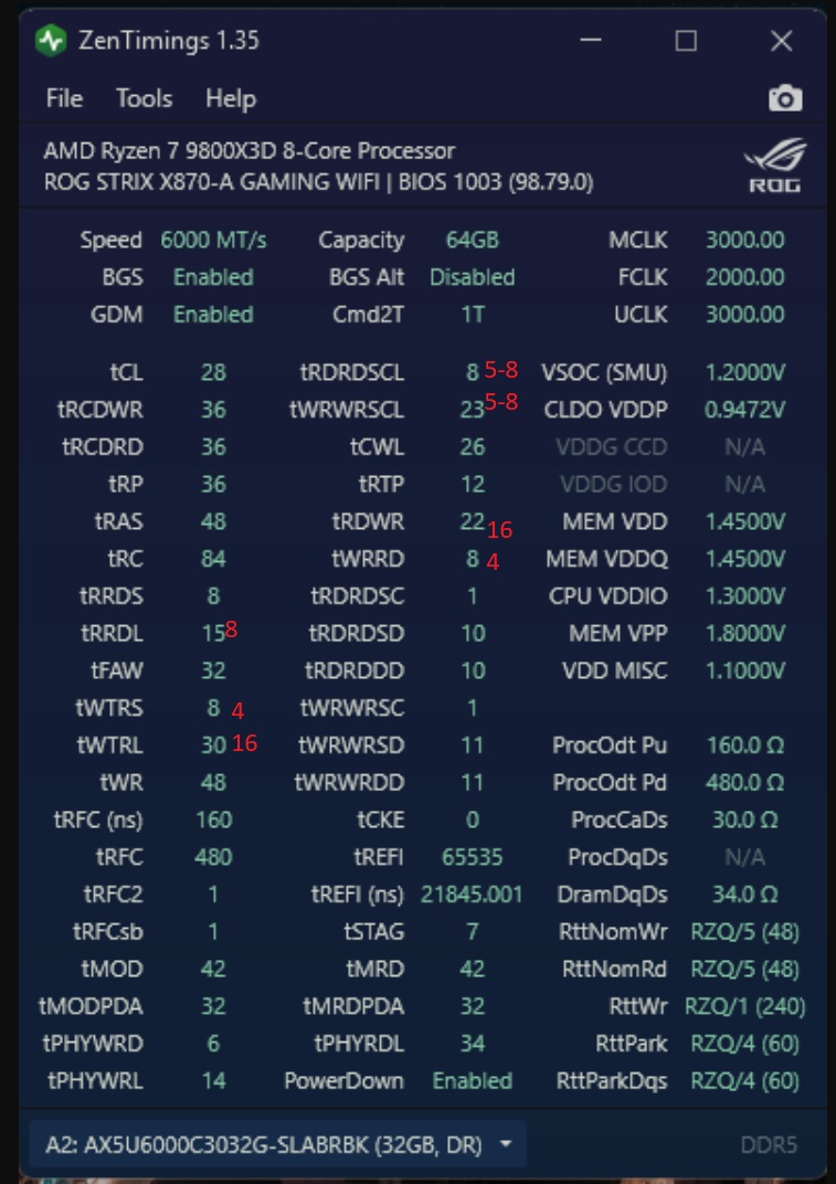 anta777 Скажите пожалуйста у меня всё нормально с напряжением и таймингами для 4 планок ? tRFC=384 спокойно держит но мне кажется из-за этого в игре Black Myth: Wukong статтеры вроде чуть лучше при 480(может надо ещё больше сделать) Я даже делал MEM VDDQ=1,2100v CPU VDDO=1,2100v и все тесты проходят без проблем, но оставил 1,2500v. Что посоветуете как лучше ? Особенно важна стабильность в играх! ZenTimings почему-то внизу показывает планки как DR но они вроде SR. P.S. GDM у меня включен, видимо с 4 планками его не реально выключить, но самый прикол он в тестах вообще не как не влияет на результаты а вот ошибки появляются.