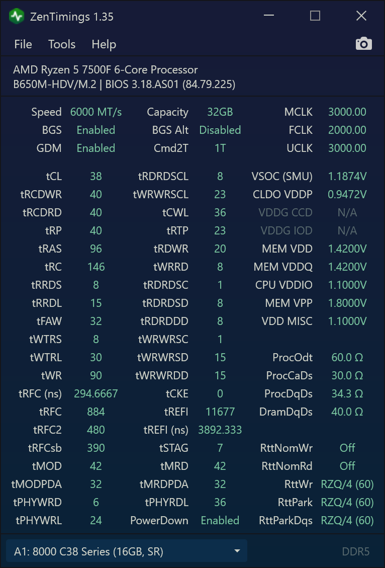 Добавлено спустя 28 минут 9 секунд: Вот на новой матери PRO B650-A WIFI , типа обновленная версии MSI MAG B650 TOMAHAWK. Все идентичное, только разница в нескольких мелочах. Томагавку больше 2 лет, а эту выпустили летом. Наконец-то удалось снизить tRFC до 384 на 6400. Нитро 1/2/0 уже не идёт, на asrock hdvm2 брало 1/2/0. Тут ещё наверное память не самый топ для разгона китайский Kingbank. Чипы хоть и hyniх a-die, но сам контроллер явно у китайцев дешман, а от него тоже зависит успешный разгон