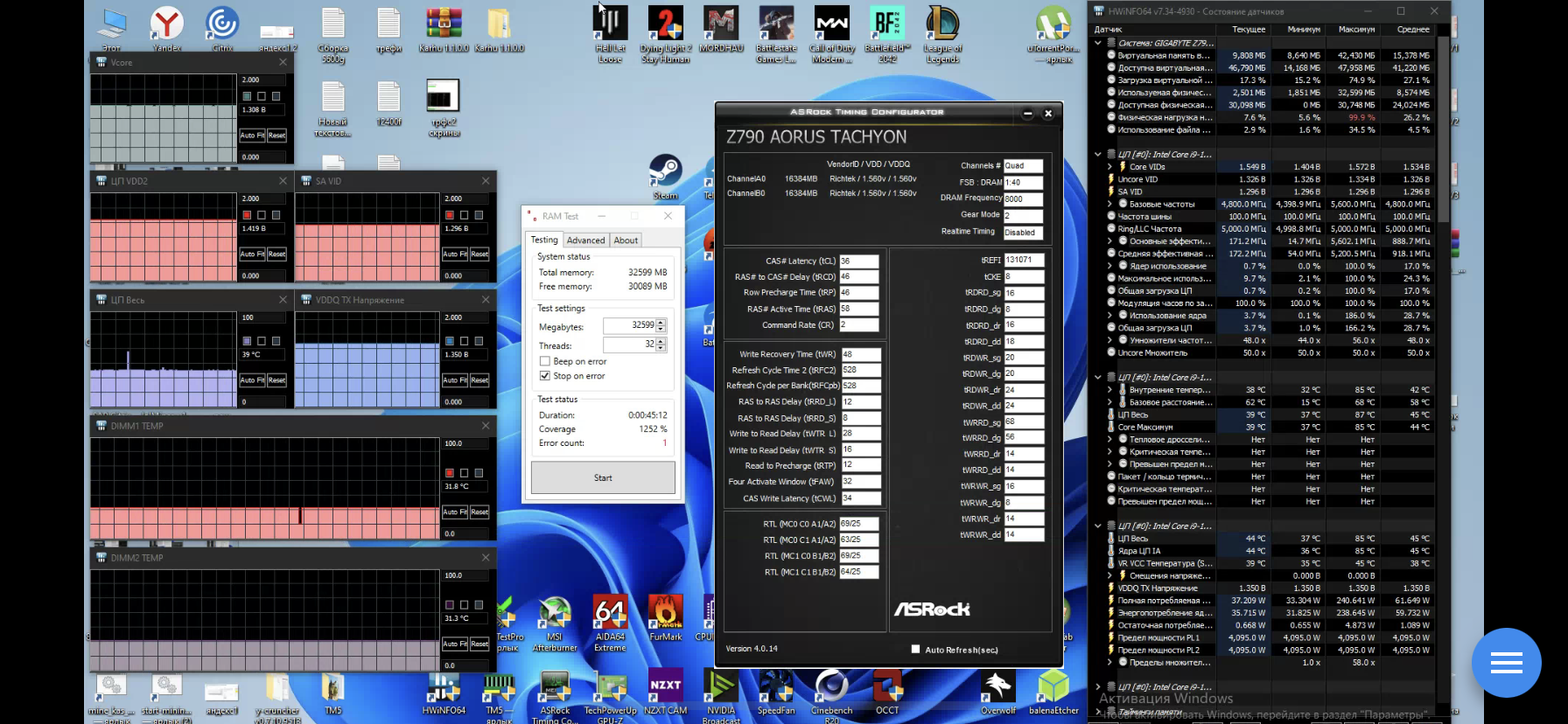 Ранее уже писал о своей проблеме ловлю ошибку в тесте Karhu при этом в ТМ экстрим/ТМ7 (сутки) ошибок нет. Пробовал ослабить ртл, на гиге в ручную никак даже с понижением вольтажа, пришлось поднять тайминги для повышения ртл (вместо 34-45-57), также пробовал ТСКЕ/ТХП в авто, занижал трефи до 32к, повышал ТРФС/ТРФСпб, ничего не помогло. Что на сл34, что на сл36 ошибка в кархе! ВДД пробовал до 1.59, SA до 1.32, vddq/tx до 1.37/1.42. Мало вольтажа?