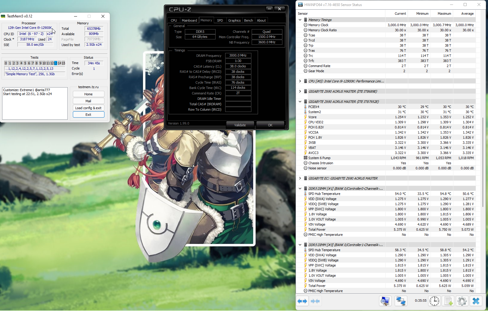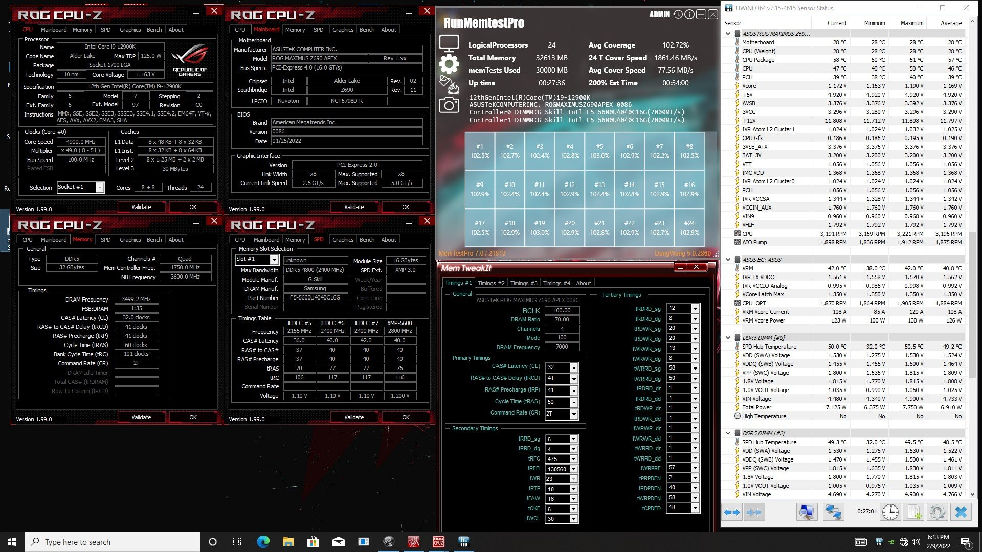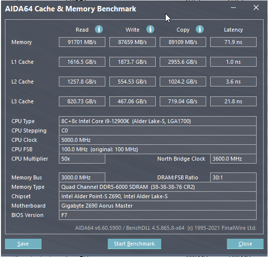 В общем пока только такие результаты на Master Z690 и 2 * 32Gb Hynix. Зато стабильно Запускается даже на 5800 со стоковым напряжением 1.1В, но на этой частоте вообще о какой-то стабильности в принципе говорить не приходится. На 5600 периодические ошибки.