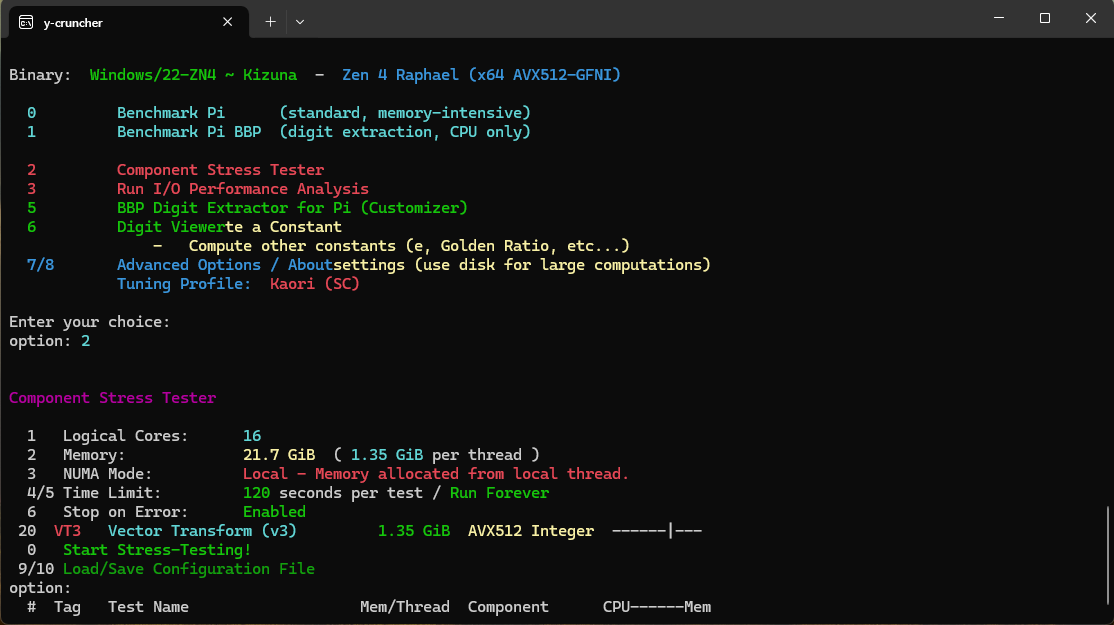 Народ скачал y-crancher с оф сайта, что то настроить не совсем получается... Тут вот что выбрать надо? У меня доступен только VT3 тест И ещё вопрос, прочитал последние 150 стр. темы, но не видел что бы кто то tRP ужимал как я до 30 к примеру, сам насколько помню выхлоп был не прям большой вроде бы от этого?