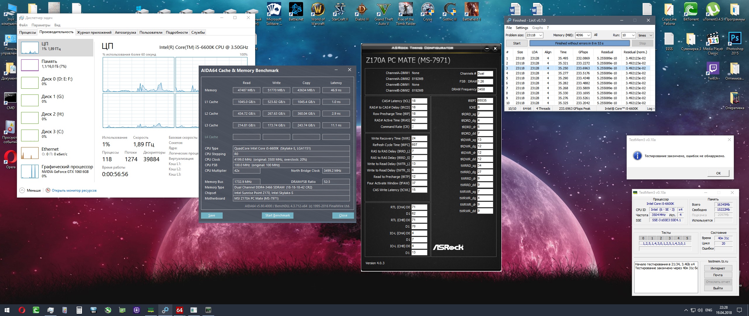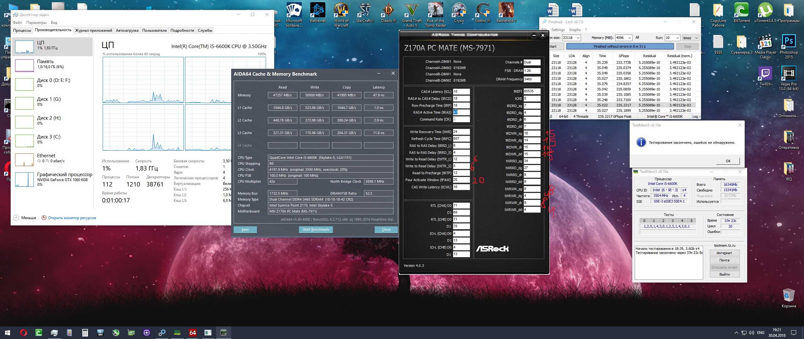 Хочу попросить помощи у местных знатоков. Первый раз разгоняю память. Пытаюсь разогнать оперативку, она у меня Samsung B-die одноранговая, вроде как нащупал стабильные 3466, но в плане таймингов совсем потерялся. Не то что бы я разбираюсь как выставлять правильно вторичные тайминги, тут буду рад любым вашим советам, но похоже, что материнка не "занижает/завышает" тайминги, а тупо убивает логику их выставления, в результате чего становиться невозможным дальнейший разгон. В режиме "авто" вторичных таймингов не удавалось получить стабильные 3200 ни на каких напряжениях DRAM volt, SA, IO. В теме по МП Asus наткнулся на сообщения пользователя VRoman , за что ему спасибо: ASUS LGA1151 на чипсете Intel Z170 (процессоры Skylake) Этой логикой пользовался, что бы найти стабильные 3200, а после 3466. Только что опять пытался брать 3600 - ни в какую, максимум удаётся прогрузиться в ОС и запустить Testmem - через пару секунд ошибка или BSOD. На повышение вплоть до vDimm -1.450v, SA - 1.250, IO - 1.200 напряжения не реагирует совсем. Попутно увидел сообщение xyligano на 427 странице со скрином таймингов - попробовал передрать тайминги под свои 3466 - заметил в его таймингах tFAW = 16, поставил у себя 20, т.к. материнка у меня автоматом ставила 36. Поставил tWTR_L=6 и _S=6 вместо 12/6 (ASRock timing conf. показывает 12/6 и сейчас - в биосе 6/6), tRDWR_sg_dg_dr_dd поставил все 15 вместо 12 (у меня материнская плата либо переставляет, либо неправильно показывает эти tRDWR_sg_dg, сейчас в биосе - 16/14 при залоченых 15/15, на скрине конфигуратора тоже, хотя обычно эти значения различаются). В итоге ошибся и случайно вбил tWRWR_dr = 8 и tWRWR_dd = 4 вместо 15/15, как на его скриншоте, и прошёл так тесты... После выставил правильно 15/15 и получил ошибку на первой минуте Testmem5... Грубо говоря, есть два условно "стабильных" резалта (скрины, 20 прогонов testmem5 + 10 прогонов линкс 0.7.0 на 4gb) на vDimm -1.250v, SA - 1.220, IO - 1.150 и vDimm -1.300v, SA - 1.200, IO - 1.150 с разными вторичными таймингами.