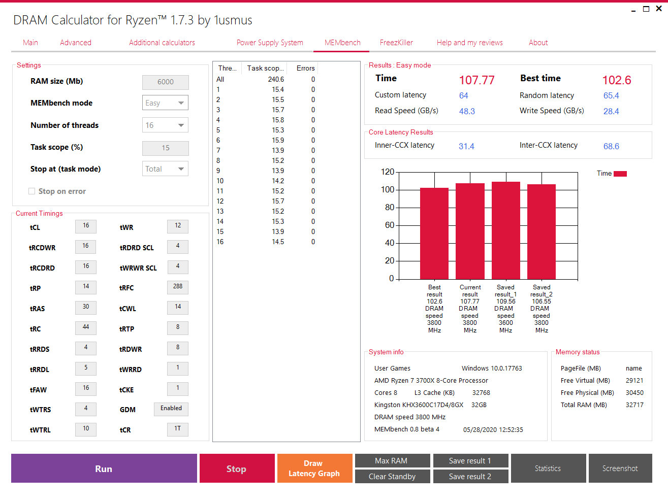 1. понизить tRCDRD до 18, - при старте мемтеста сразу синий экран (сильно не пытался задирать напряжение, потому как на 1.39 картина никак не менялась); 2. geardown не выключается на этих плашках, либо не получается нащупать параметр, который даст это сделать. В итоге либо глухой чёрный экран и clear_cmos, либо висюкан на логотипе ROG с зелёным индикатором на boot; 3. пробовал выйти на частоту выше (3.466) с половиной автоматических настроек в таймингах: мемтест сразу сыпет ошибками; 4. попытки запустить 3.533 и 3.600 по калькулятору успехом не увенчались. Однако на 16-20-20-20-40 система заводится и можно даже попасть в операционную систему; 5. на 3.400 tRFC максимально получается спустить до 310, но система нестабильна