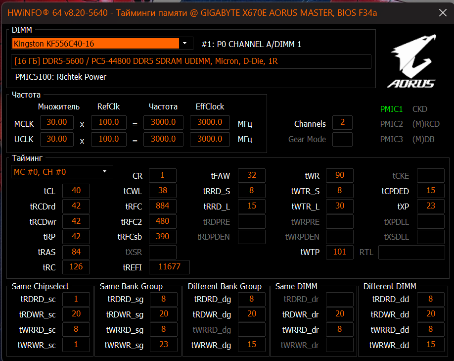 Напряжение менял, до 1.35 - не влияет никак Родной 5600 [16 ГБ] DDR5-5600 / PC5-44800 DDR5 SDRAM UDIMM, Micron, D-Die, 1R это показывает hwinfo соответственно наверное D rev