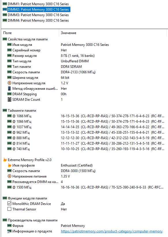 Однако после установки AIDA показывает, что комплекты все же разные по поддерживаемым режимам и профилям XMP. Диспетчер задач показывает, что частота работает на 2933 MHz, как и было с 1 комплектом.