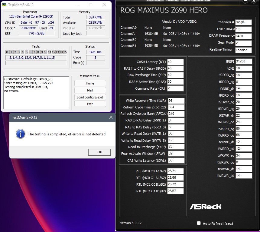 Вроде пока удалось получить стабильные настройки и под ОС (правда балкон был открыт , что способтсовало лушчей терпостабильности). Интересно , что тонкая настройка, похоже что, особо бонуса не дает(для сравнения можете дать эталонные 6400? Интресно было бы глянуть. Я помню, вроде бы Alzov ПСП было 110+ но для каких настроек не помню).