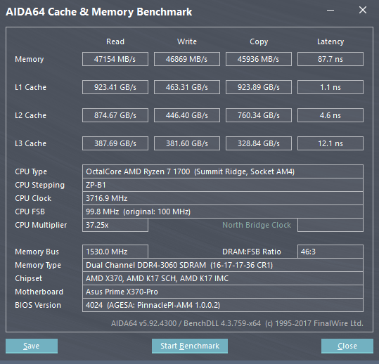 А так это вполне себе результат для ryzen первого поколения, двухранговой памяти на asus x370 prime (эта доска как и её "младшая сестра" prime b350 плохо гонят память).