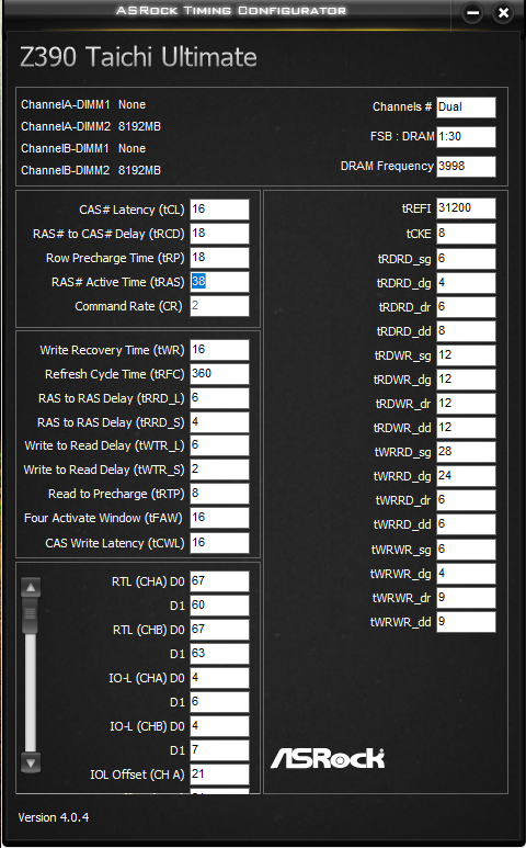 Начните с RCD, CL. Не обязательно должны быть одинаковыми, обычно CL идёт меньше чем RCD. RAS сразу пробуйте как RCD+CL+4, до этого значения от него существенная разница, дальше меньше. CWL<=CL. Допустимые значения 9,10,11,12,14,16,18,20. RP можете выставить по RCD, если пойдёт меньше - тоже неплохо, не уверен правда насчёт смысла. RTP без формул. Если не идёт вниз можно попробовать поднять чуть чуть RP. В DDR4 явно связан с WR соотношением 2 к 1 (например WR20\RTP10), физически хранится одно значения и в зависимости от операции интерпретируется. Скрутите FAW до 16(так и оставьте если работает). С таким FAW скручивайте RRD(оба, L обычно больше чем S), возможно поедут на 4 оба. Если до 4 не удалось спустить поднимите FAW до уровня RRDL*4 и попробуйте ещё, хотя это скорее всего уже почти предел. Обычно L>=S. L - SG(Same Group). S - DG(Different Group) Напр. RRD_L>=RRD_S. CKE=5 СCDL>=4 RDRD_DD и прочие подобные можно проигнорировать если у вас нет двух планок на один канал (4 планки). DD-Different Dimm. Тоже самое с DR-Different Rank если у вас одноранговая память. RDWR_SG(DG) и подобные сочетания скручивайте до минимальных рабочих, потом накиньте сверху +2. Как уже отметил обычно SG>=DG. WTR не трогайте он сам спустится когда будете скидывать WRRD_SG(DG) и прочие подобные. Если сам меньше не стал тогда руками скидывать. WR снижать через WRPRE если есть. Если нет или не снижает WR, То скрутите его скажем до 12 или +4 от рабочего, потом дожмёте если не лень будет. RFC явных формул нет, крутить после всего списка сверху. Не пытайтесь найти его минимальное значение если не хотите чтобы память начинала сыпать ошибками от любого чиха. найдите пограничное со стабильностью значение и накиньте сверху 20 или сразу 40. Может реагировать на RAS+RP, RRD, FAW, причём в обе стороны (то есть может "сломаться" если задрать названные), а может и не реагировать... REFi больше лучше. Связан с RFC. REFI сколько память "работает" - RFC сколько "отдыхает". Оба тайминга лучше не пытаться найти предельное значение.Заметно реагируют на температуру. Многие тайминги отзываются и на температуру и на напряжение. Поскольку напряжение может как позволить снизить тайминг, так и увеличить температуру, то середину можно искать очень долго, поэтому лучше бы вовремя остановится. Тестируйте тщательно с перезагрузками, сном, холодным стартом. RTL и IOL вам кто-то другой пусть советует как настраивать, от них у меня голова болеть начинает...