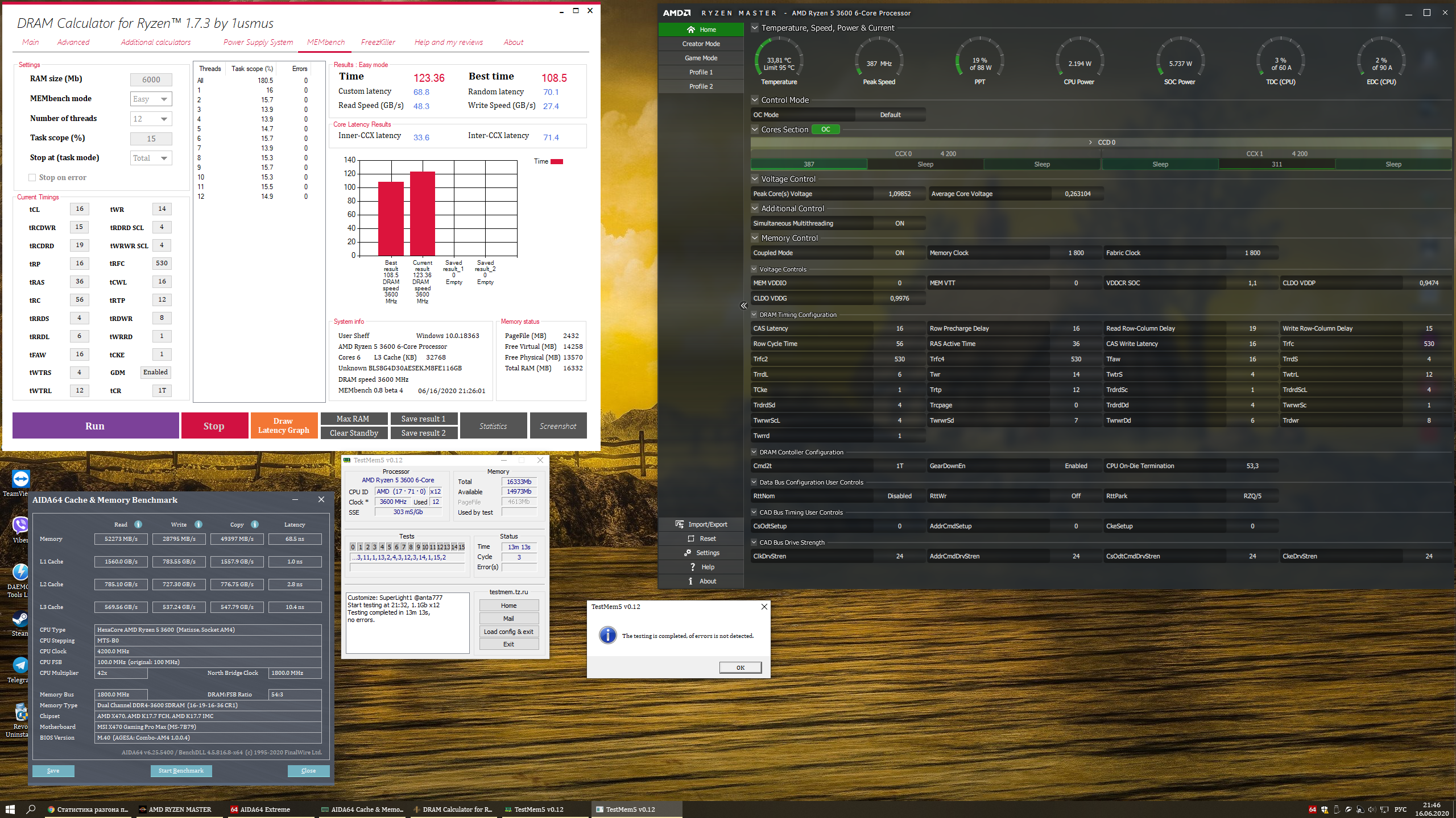 Подскажите пожалуйста, какие тайминги еще можно подкрутить что бы снизить латентность, добавить скорости? R5 3600, Crucial Ballistix U4 3000 mhz. Сначала до 3600 разогнал, но на Asrock B450 Pro4 какая-то шляпа с регулировкой SOC voltage, из-за чего он подскакивал до 1.187, я вручную offsetom убирал до 1.112 (ниже никак, а основная функция регулировкии soc не работает), поэтому пришлось остановиться на 3533 вот с такими параметрами (soc 1.05):