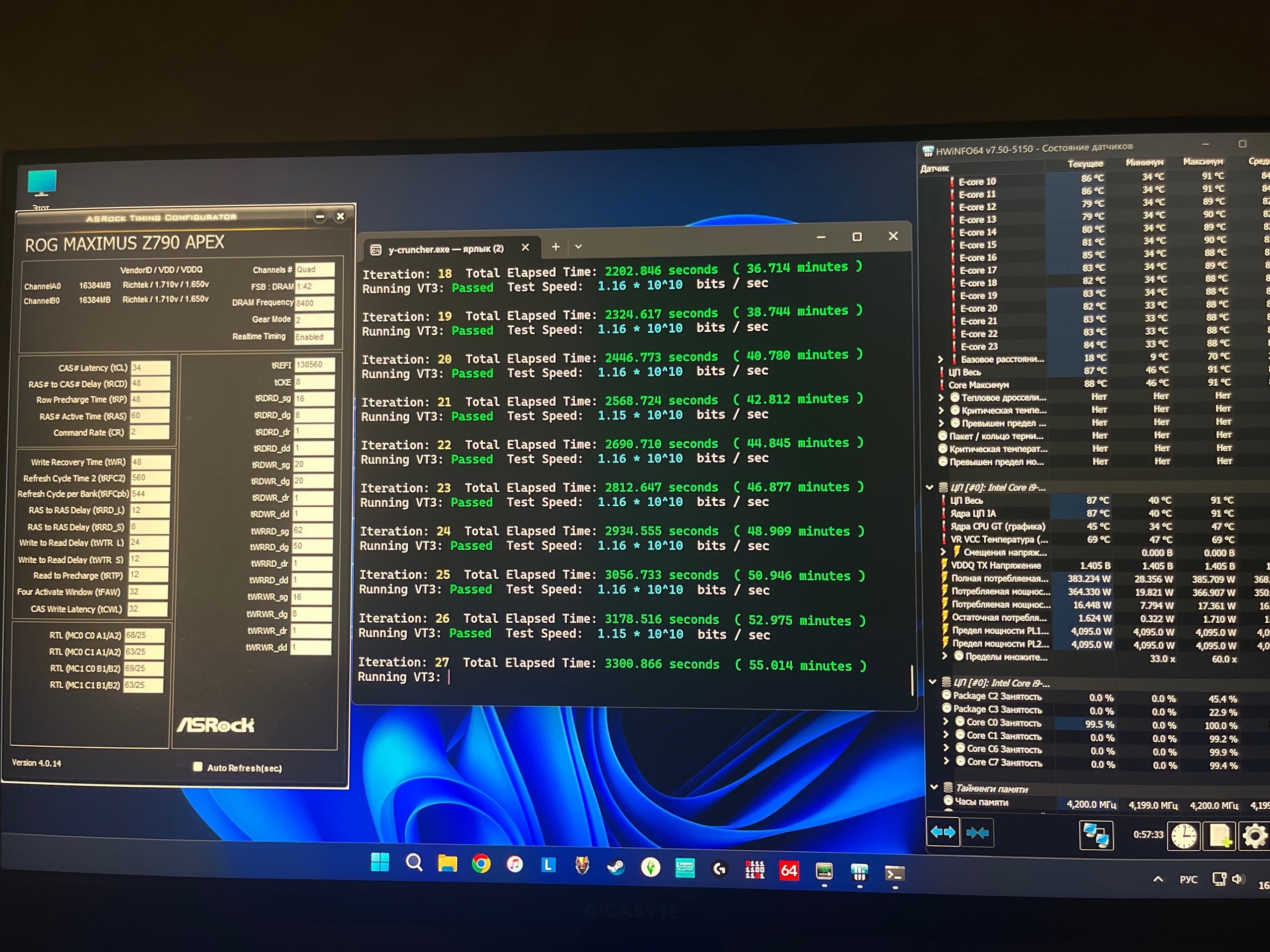 для любых тестов памяти достаточно и до 1.6 на память, а вот кранчер оч много просит накинуть, тут уж ничего не поделать. на СА свыше 1.3 проц оч плохо реагирует, рандом бсоды, зависоны на рабочем столе и т д, хотя в тестах все ок. типа проходишь тесты в течение суток, офаешь тест, и комп зависает))). а так в принципе насчет хай напруг... не сильно жалко. самые дешевые плашки, 9к за кит. и еще пару комплектов запасных лежит)) конкретно данному киту памяти становится плохо после 1.75 VDDQ, PMIC может уйти в защиту (так уже было, но чинится за 5 минут посредством залития SPD профиля обратно. Мне больше всего непонятно, почему 262к трефи ни в какую не едет. уже столько плашек перетыкал, ну не может же быть такого, что никакие ни на каком фреке не могут в 262к. темпы позволяют, но даже на воде в 10 градусов и плашках в 12-13 градусов все равно из за максимального трефи вылазят ошибки.