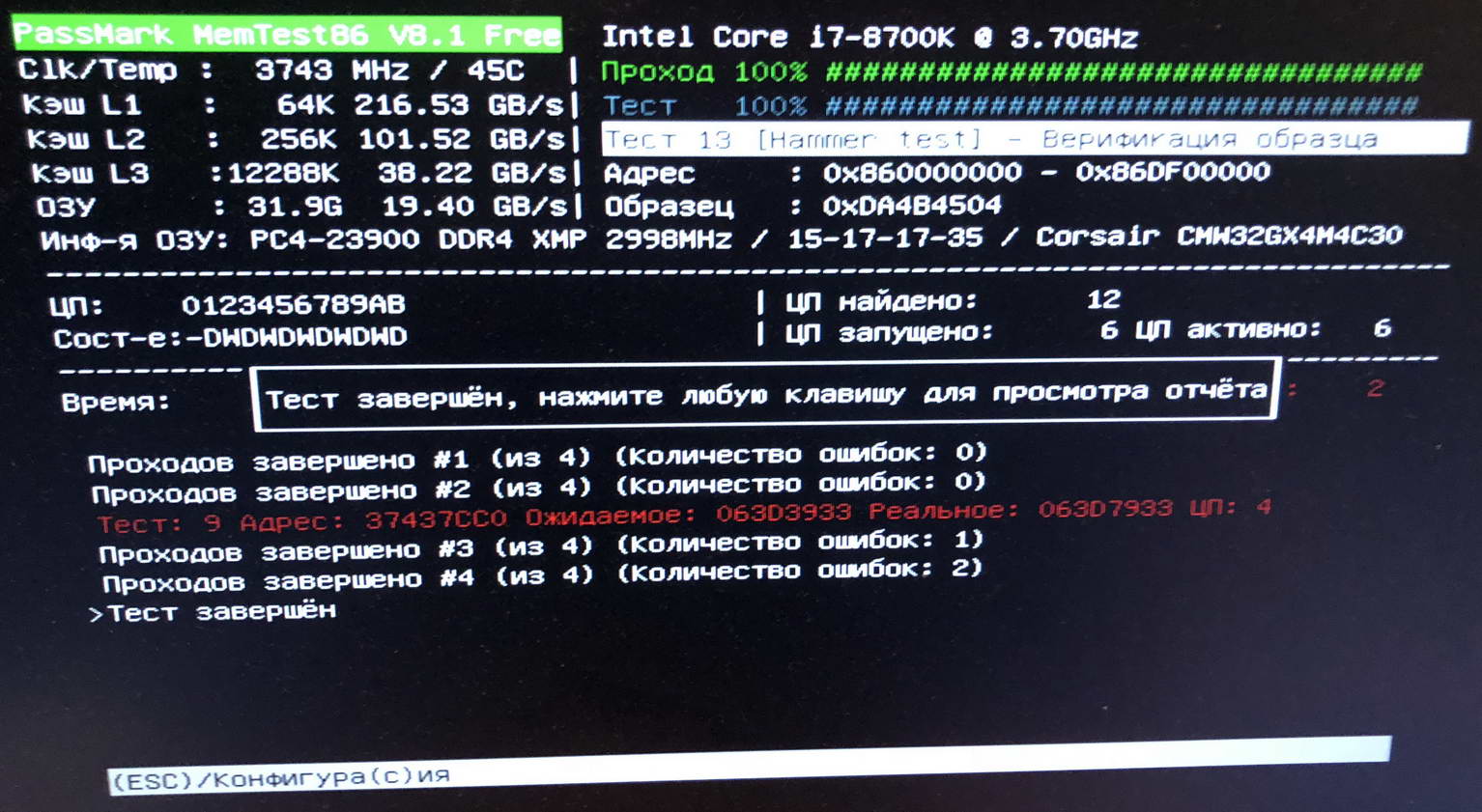 В продолжение, был тест на 2666. Изменил в биосе только частоту памяти. Тайминги и напругу оставил прежними. Результат будет немного в другом виде, потому что после прохождения теста комп....завис. Все работает, монитор тоже, а клавиатура - нет. Потом перезагрузка, изменение в биосе частоты до 3000, вход в windows. Через 10 мин и загрузке оперативки до 7-8гб обычными приложениями (браузерами и тд), словил опять зависание. Мышка активна, окна приложений и клавиатура - нет. После последующей перезагрузки через reset, комп работал стабильно еще несколько часов. Хотя были тесты и linX, aida64 для процессора. Странно, в корпусе просторно(cooler master haf x), на время тестирования оперативной памяти боковые стенки были сняты, температура в комнате 23-24 градуса. Например, memtest, которые выкладывались раннее, двумя постами ранее, то в комнате была температура 16 градусов. И все равно ошибки.