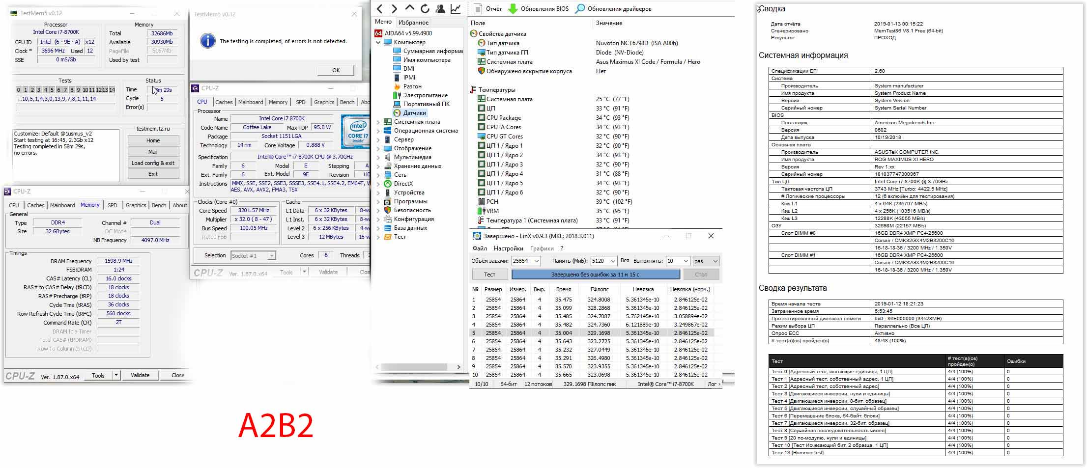 PredatorUA Был взят третий комплект, без всяких rgb и прочего. Две планки. CMK32GX4M2B3200C16R. (sk hynix) Сначала провел тесты в A2B2, потом в A1B1. Все успешно. Для уверенности выставил вручную напряжение 1.36, частоту и тайминги. Результаты тестов ниже. Можно ли считать, что все слоты у материнской платы держат более 2666, или это проверять нужно сразу 4-мя планками оперативной памяти? P.S. Если сравнивать радиаторы у CMW32GX4M4C3000C15 (которые с rgb) и CMK32GX4M2B3200C16R (которые lpx), то мне по тактильным ощущениям больше доверия внушает lpx. Как-то качественнее и ближе к радиаторам dominator.