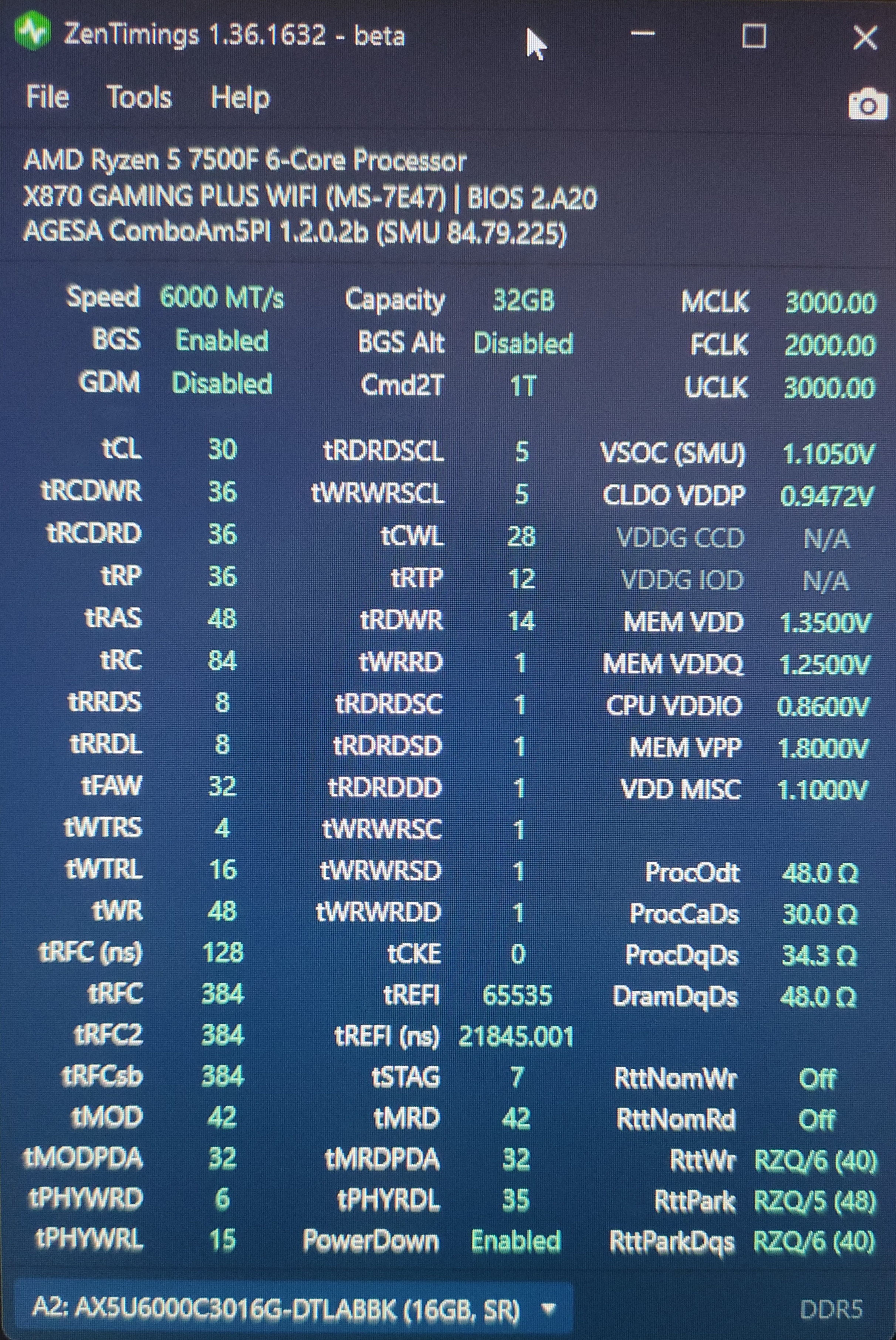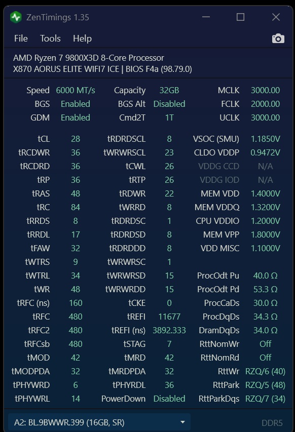 RttNomWr и RttNomRd умышленно отключали. Гляжу тоже на матери Gigabyte и процессор 9800X3D. Но не могу 4 планки по 32GB свои 6000 CL36 завезти в 6000, только 4800. Что за память?