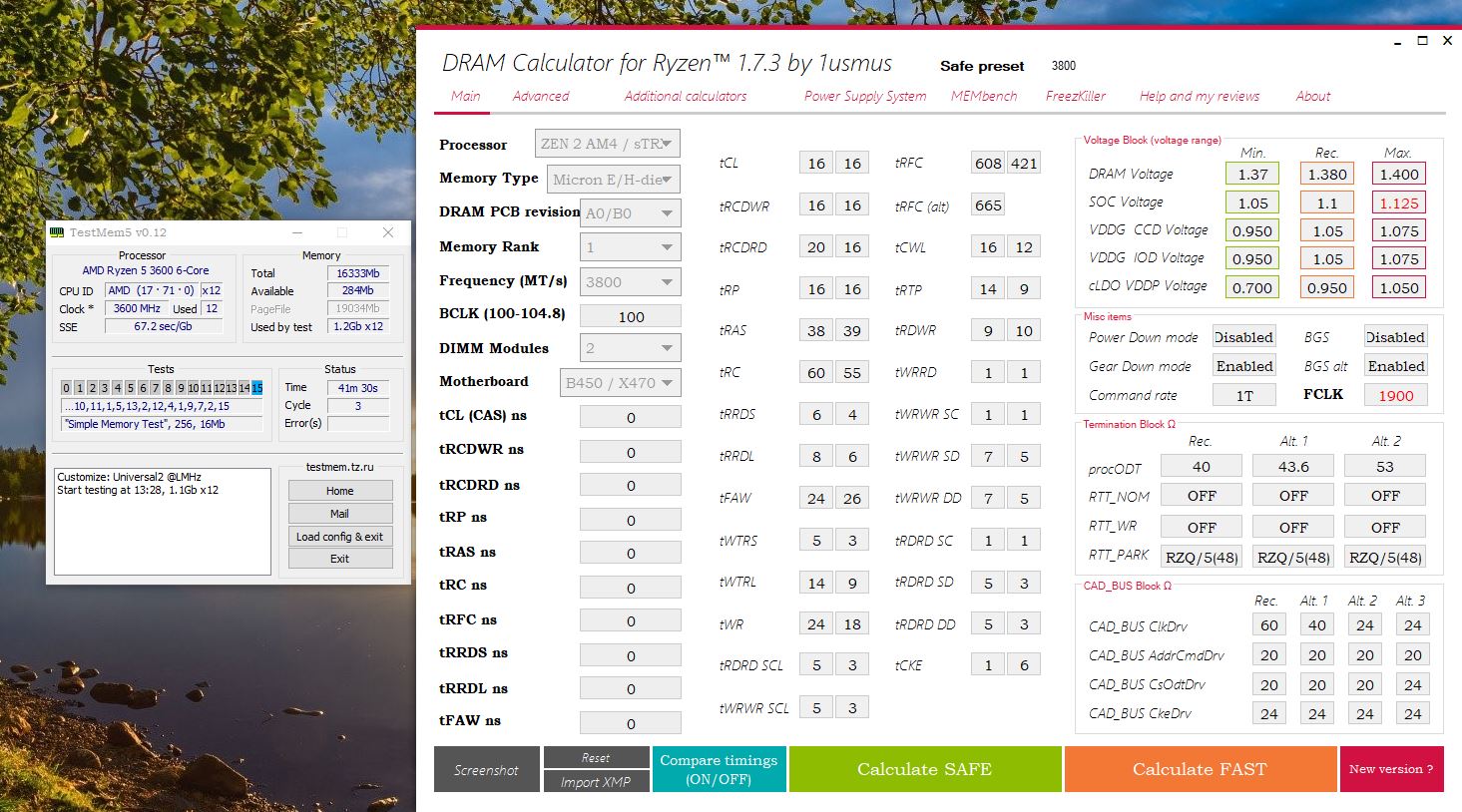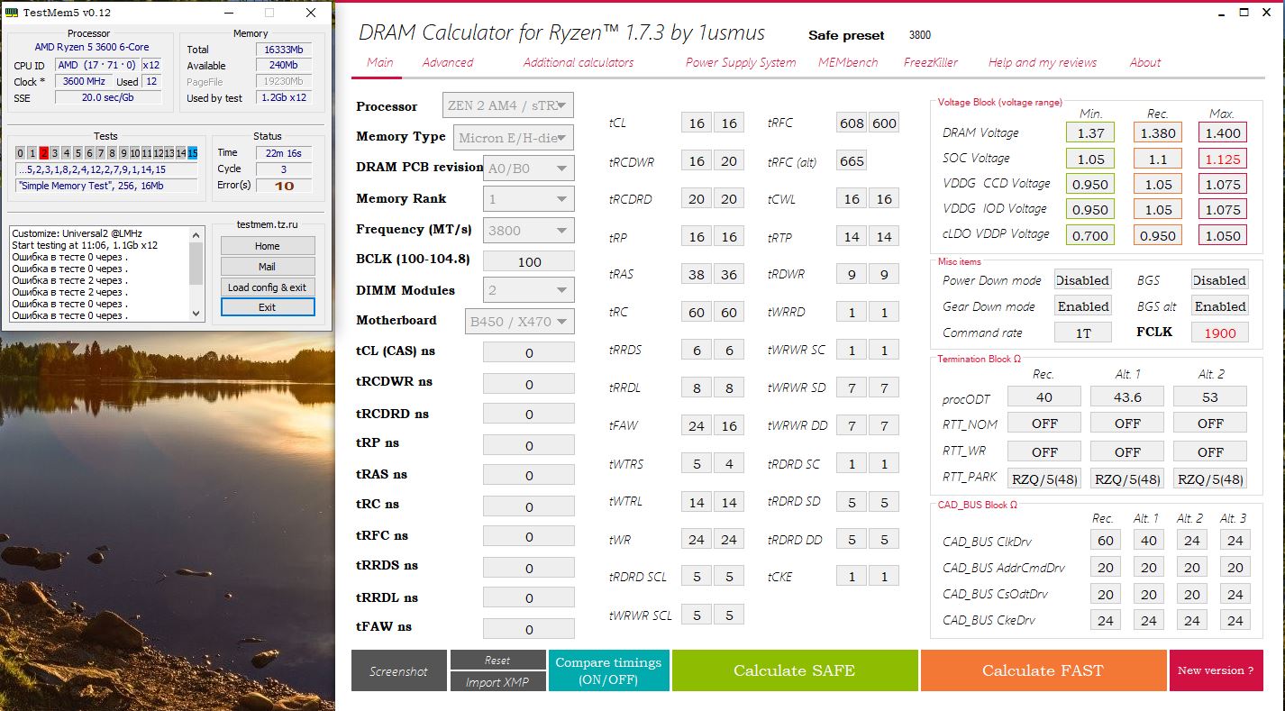Задача на 3800Mhz была изначально. Как мне говорили, чтобы взять эту частоту совсем делать ничего не нужно, только накинуть частоты памяти и IF. Как выяснилось, делать нужно и делать нужно очень много. Началось с калькулятора, когда он был простым ориентиром, xyligano даже корректировал некоторые тайминги, но потом он стал занят и его больше я не беспокоил, на 3600Mhz настраивал сам, без калькулятора. В итоге, нашёл стабильность вроде как. Потом успокоился, но читая тему каждый раз мне покоя не даёт мысль, что не может такого быть, чтобы эти хвалёные микроны не взяли 3800Mhz, и пошёл снова за разгоном. Но как оказалось, чтобы дать +200Mhz сверху нужно перелопатить кучу таймингов и вот тут вопрос, который я задаю прямо уже который раз. Есть вот желаемая частота - 3800Mhz. Есть с десяток таймингов. Какую группу таймингов нужно крутить в ПЕРВУЮ очередь, чтобы найти стабильность на частоте? Я так понимаю, что есть тайминги, которые отвечать за стабильность, есть те, что дают производительность. Вот и вопрос, смысл крутить вторые, если мы ищем пока стабильность. Вот сейчас уже, взял калькулятор и прям по нему Safe Preset вбил тайминги на 3800Mhz. Итог - сыпет ошибки после 9 или 10-й минуты.