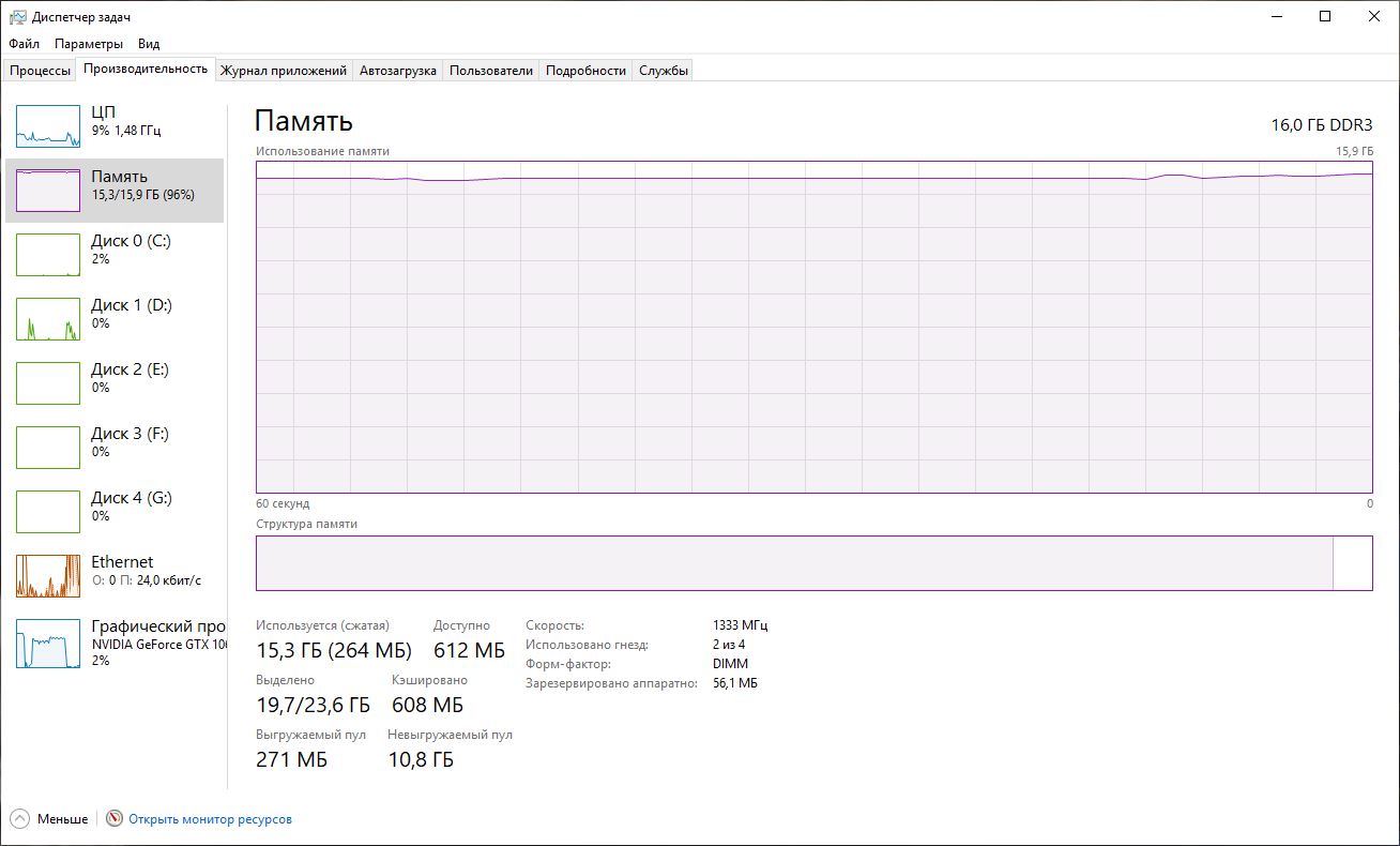 Народ, есть проблема. Win10, память в профиле, бывает так, что всю память что то сжирает под 100% (что в стоке, что в разгоне), судя по диспетчеру задач, комп начинает подтормаживать, ребут помогает. Что это может быть и как это лечить? Проблема с виндой или что то с ОЗУ?