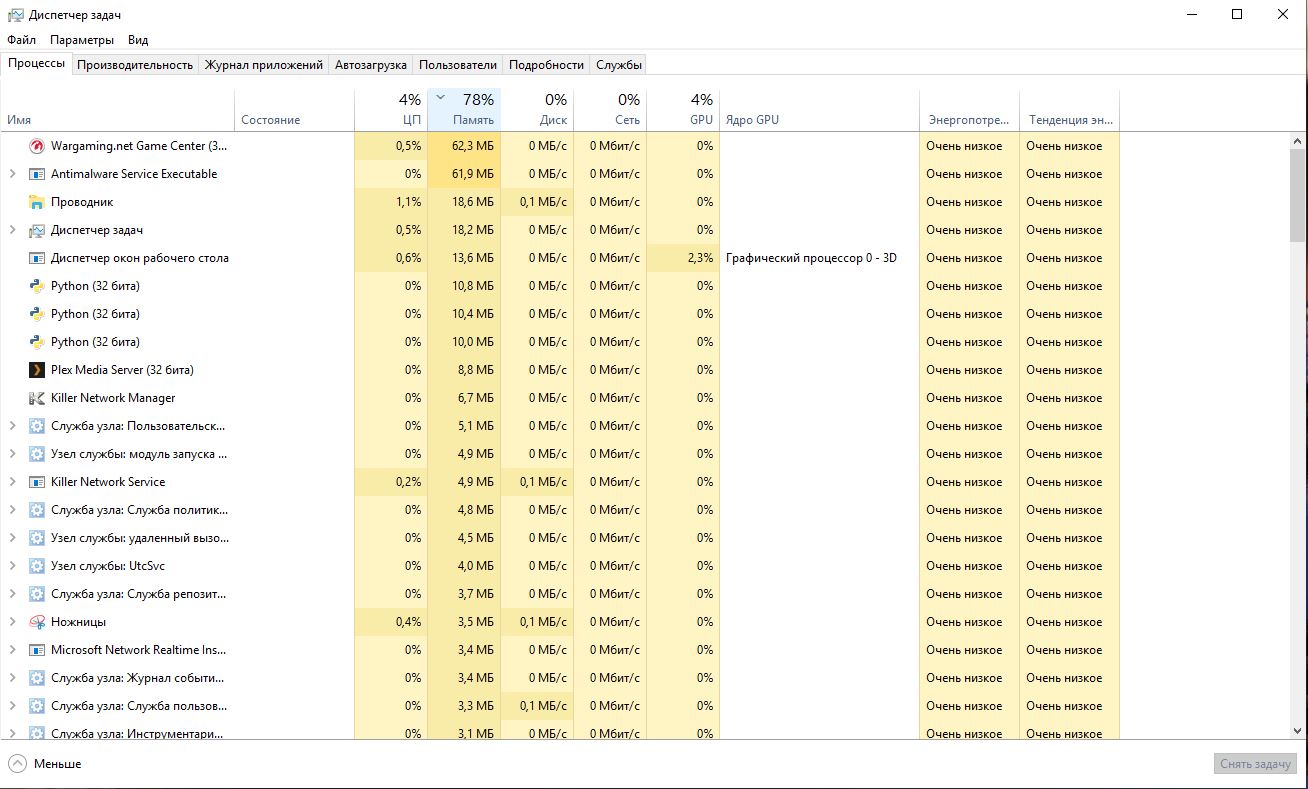 Поясните, пожалуйста, - какой из процессов, показанных в диспетчере, забирает больше всего ресурсов памяти и ЦПУ, и где со временем потребление ресурсов заметно возрастает? Какие ошибки в логах?