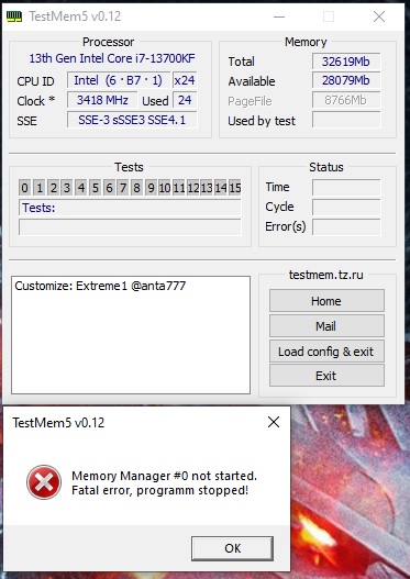 Что-то я не пойму, в чём причина, предыдущие версии на 13700K работали. Изменения которые я сделал в системе, это разгон ЦП и выключение изоляции ядра + виртуализации. Уважаемые форумчане, подскажите куда копать, y-cruncher отлично жарил память, для чего он мне собственно и нужен.