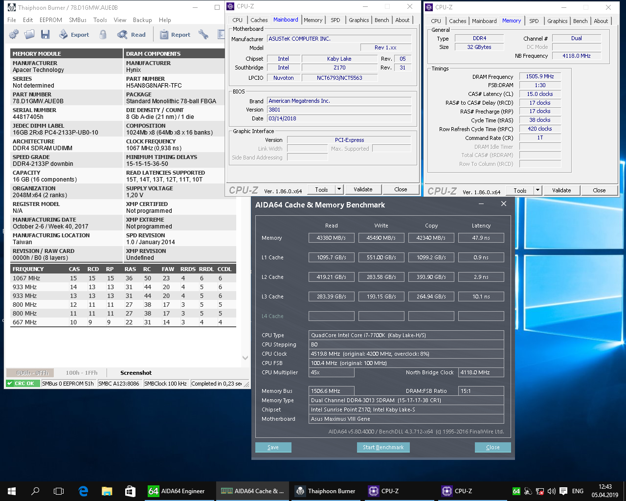 Достал из заначки пару планок Apacer DDR4-2133 16GB AU16GGB13CDYBGH На чипах маркировка Apacer, но Thaiphoon Burner определяет их как Hynix AFR. Результат на копейку лучше, чем у упомянутого выше Kingston'а, почти 1 в 1 как у G.Skill Aegis.
