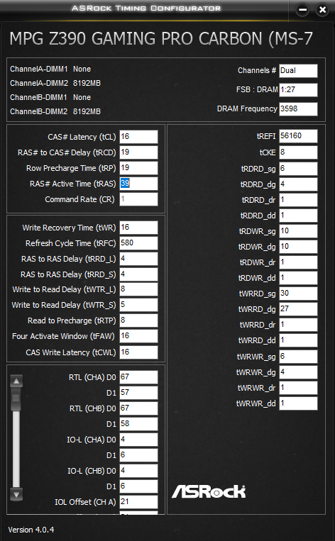 Начните с RCD, CL. Не обязательно должны быть одинаковыми, обычно CL идёт меньше чем RCD. RAS сразу пробуйте как RCD+CL+4, до этого значения от него существенная разница, дальше меньше. CWL<=CL. Допустимые значения 9,10,11,12,14,16,18,20. RP можете выставить по RCD, если пойдёт меньше - тоже неплохо, не уверен правда насчёт смысла. RTP без формул. Если не идёт вниз можно попробовать поднять чуть чуть RP. В DDR4 явно связан с WR соотношением 2 к 1 (например WR20\RTP10), физически хранится одно значения и в зависимости от операции интерпретируется. Скрутите FAW до 16(так и оставьте если работает). С таким FAW скручивайте RRD(оба, L обычно больше чем S), возможно поедут на 4 оба. Если до 4 не удалось спустить поднимите FAW до уровня RRDL*4 и попробуйте ещё, хотя это скорее всего уже почти предел. Обычно L>=S. L - SG(Same Group). S - DG(Different Group) Напр. RRD_L>=RRD_S. CKE=5 СCDL>=4 RDRD_DD и прочие подобные можно проигнорировать если у вас нет двух планок на один канал (4 планки). DD-Different Dimm. Тоже самое с DR-Different Rank если у вас одноранговая память. RDWR_SG(DG) и подобные сочетания скручивайте до минимальных рабочих, потом накиньте сверху +2. Как уже отметил обычно SG>=DG. WTR не трогайте он сам спустится когда будете скидывать WRRD_SG(DG) и прочие подобные. Если сам меньше не стал тогда руками скидывать. WR снижать через WRPRE если есть. Если нет или не снижает WR, То скрутите его скажем до 12 или +4 от рабочего, потом дожмёте если не лень будет. RFC явных формул нет, крутить после всего списка сверху. Не пытайтесь найти его минимальное значение если не хотите чтобы память начинала сыпать ошибками от любого чиха. найдите пограничное со стабильностью значение и накиньте сверху 20 или сразу 40. Может реагировать на RAS+RP, RRD, FAW, причём в обе стороны (то есть может "сломаться" если задрать названные), а может и не реагировать... REFi больше лучше. Связан с RFC. REFI сколько память "работает" - RFC сколько "отдыхает". Оба тайминга лучше не пытаться найти предельное значение.Заметно реагируют на температуру. Многие тайминги отзываются и на температуру и на напряжение. Поскольку напряжение может как позволить снизить тайминг, так и увеличить температуру, то середину можно искать очень долго, поэтому лучше бы вовремя остановится. Тестируйте тщательно с перезагрузками, сном, холодным стартом. RTL и IOL вам кто-то другой пусть советует как настраивать, от них у меня голова болеть начинает...