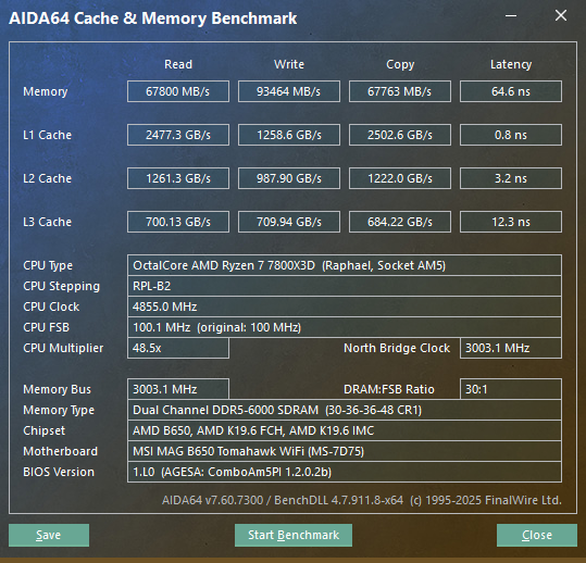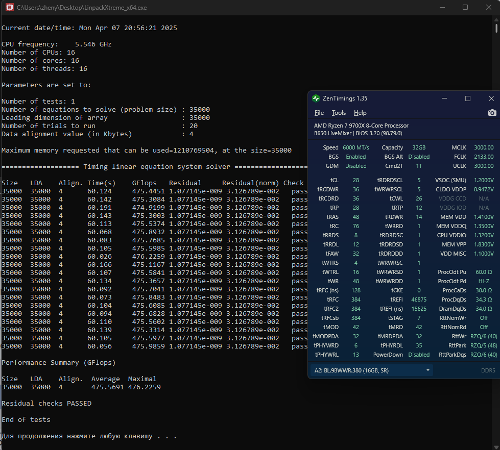 ОЗУ G.Skill F5-6000J2836G16GX2-TR5NG, 28-36-36-96, штатное напряжение 1,4В.