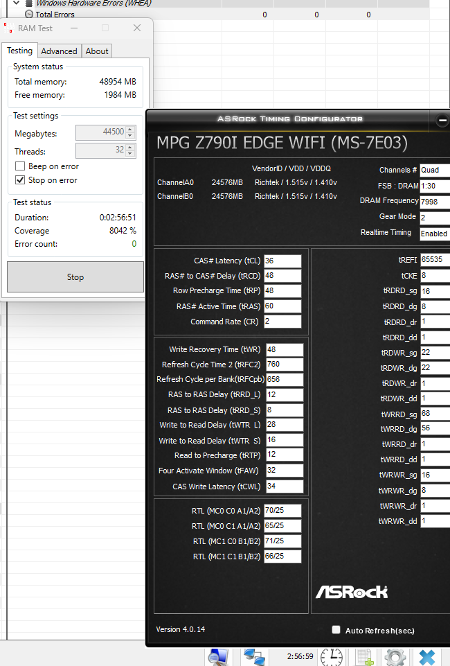 МСИ Z790 очень плохи в разгоне выше 7000, кроме мелкого ЕЖика, я выше 7200 так на них и раптор не стабилизировал. А у Альдеров 6600 на мдае и 6800 на Адае обычно предел на простых матерях. На ЕЖЕ Z690 с Альдером у меня максимальный стаб с Мдаем был 6666С30 На ЮнифаеХ с Мдаем и Альдером 6800 предел был. Сменил проц на Раптора и Мдай поехал 7200, а Адай 7800, естественно на ЮнифиХ. Сейчас есть мысли взять Мдай 24гб*2 кит - там думаю 8000-8200 упор будет.