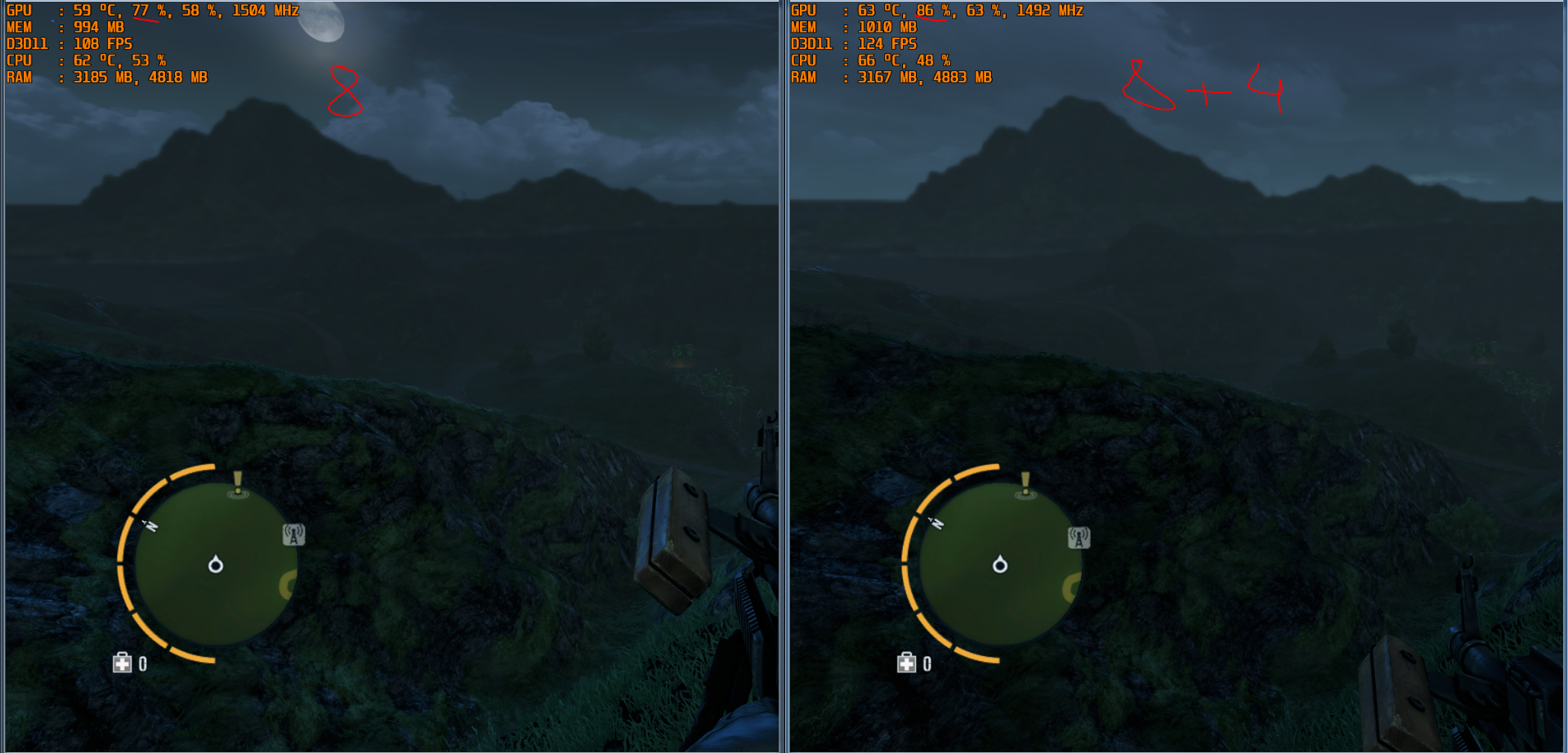 Far cry 3: было 82% \ 114 FPS стало 95% \ 132 FPS