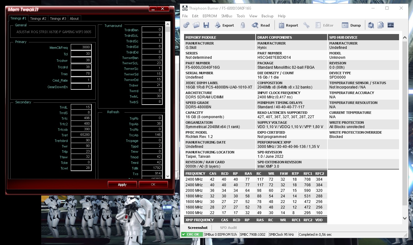 1.Устанавливаем напряжение на память, смотрим на xmp-профиль или выставляем свое. VDD=VDDQ=VDDIO. Остальные напряжение (vddp,vsoc) в авто. FCLK=2000, поднимать будем уже после нашего разгона памяти и полной ее стабильности. Выставляем желаемую частоту памяти (в режиме 1:1 6000-6400, в режиме 2:1=7600-8000). Тайминги все выставляем по джедек или профилю, чтобы гарантировать их полную работоспособность на данной частоте. Наша цель на этом этапе определить возможность работы контроллера на данной частоте, это касается в первую очередь режима 1:1. Для режиме 2:1 главное определить возможность памяти стабильно работать на жтой частоте, связано с таймингом BL/2, что зависит от частоты. Тут же ищем минимальные напряжения. Перед этим можно заняться поиском минимального нитро, так как оно зависит от напряжений. 2. После полной стабильности 1-го этапа приступаем ко второму - тюнинг таймингов. 3. После полной стабильности приступаем к разгону fclk.
