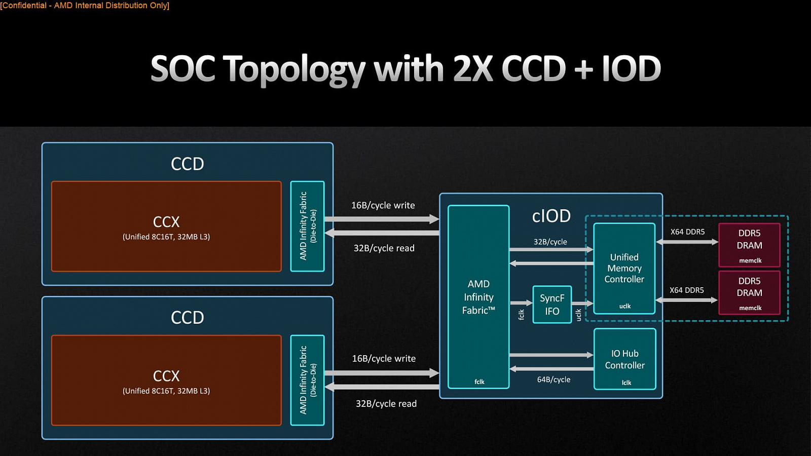Новый 6-нм cIOD содержит двухканальный контроллер памяти DDR5 (реально обслуживает 4 канала по 40 бит, включая ECC и поддержку шифрования с аппаратным ускорением) со встроенной поддержкой DDR5-5200; PCI-Express 5.0 x28; контроллер USB 3.2 с поддержкой портов 2x2 20 Гбит/с, сквозного порта USB-C и DisplayPort от iGPU. Частоты FCLK Ryzen 7000 аналогичны доменам серии Ryzen 5000. FCLK определяет тактовую частоту Infinity Fabric, которая не связана с UCLK (тактовая частота контроллера памяти) и MCLK (тактовая частота DRAM). AMD заявляет, что DDR5-6000 является «свитспотом» в том смысле, что это самая высокая частота MCLK, с которой может работать процессор, сохраняя при этом определенные оптимизации для разгона памяти. Однако уже на данный момент можно встретить экземпляры, которые работают на частоте 6400. В Zen 3 мы бы старались запустить Infinity Fabric синхронно с памятью, но это больше невозможно, потому что FCLK не может достигать 3000 МГц (при условии использования памяти DDR5-6000). Теперь оптимальная конфигурация - запустить FCLK на 2000, делитель 3:2. Выбор «Авто» в BIOS будет автоматически направлен на эту настройку. Выше 6000 МГц стратегия изменится на соотношение 1:2. Но это соотношение можно изменить вручную.