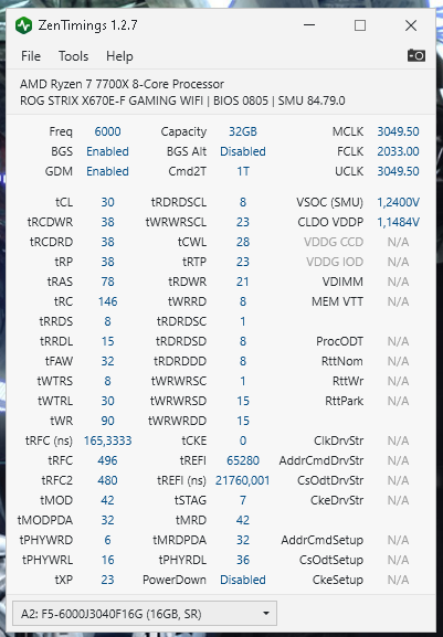 1.Устанавливаем напряжение на память, смотрим на xmp-профиль или выставляем свое. VDD=VDDQ=VDDIO. Остальные напряжение (vddp,vsoc) в авто. FCLK=2000, поднимать будем уже после нашего разгона памяти и полной ее стабильности. Выставляем желаемую частоту памяти (в режиме 1:1 6000-6400, в режиме 2:1=7600-8000). Тайминги все выставляем по джедек или профилю, чтобы гарантировать их полную работоспособность на данной частоте. Наша цель на этом этапе определить возможность работы контроллера на данной частоте, это касается в первую очередь режима 1:1. Для режиме 2:1 главное определить возможность памяти стабильно работать на жтой частоте, связано с таймингом BL/2, что зависит от частоты. Тут же ищем минимальные напряжения. Перед этим можно заняться поиском минимального нитро, так как оно зависит от напряжений. 2. После полной стабильности 1-го этапа приступаем ко второму - тюнинг таймингов. 3. После полной стабильности приступаем к разгону fclk.