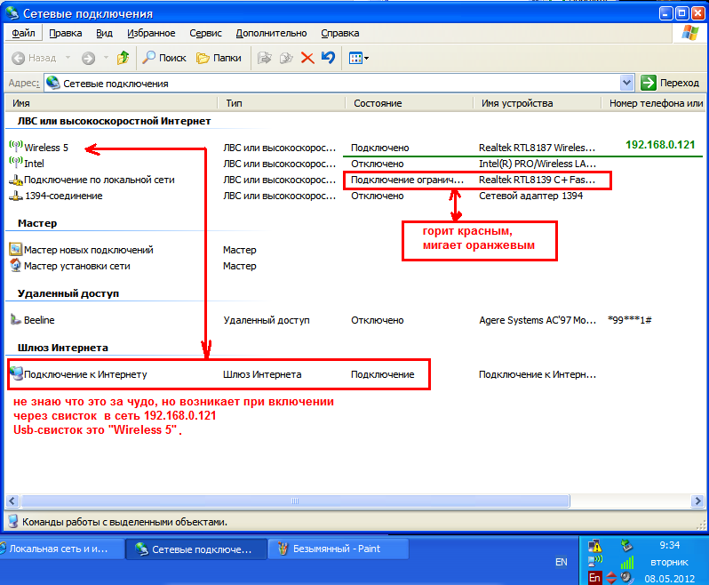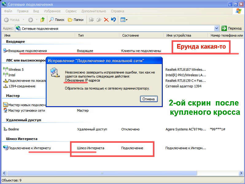 Rimsky сделал второй раз кросс (в первый раз контакты напутал точно)...но во второй раз всё равно ничего нет... вернул кабель в исходное состояние (чтобы проверить кабель и сетевухи) ...достал роутер и обнаружил, что сетевуха Intel Gbit LAN (там где надо принять кабель с инетом (Win7) и даже при коннекте горит красным/и оранжевым мигает (чудо какое-то...) - кабель, сетевухи нормальные - роутер и там и там работает (см. картинку)