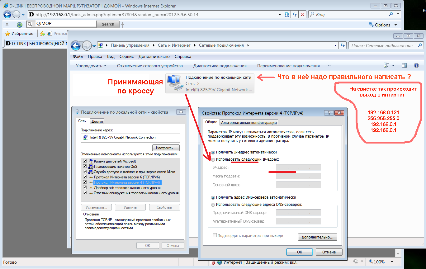 объясните , дураку, чего написать в настройки Intel ....днс, iP и так далее...? (и свистку может чего надо ещё кроме галки Общего доступа? ))) два-три года назад... сам, без помощи, и за 5 мин. настроил такое же соединение (но тогда был более простой свисток-usb в том прошлом случае) и что куда 2-3 года назад написал там не помню...
