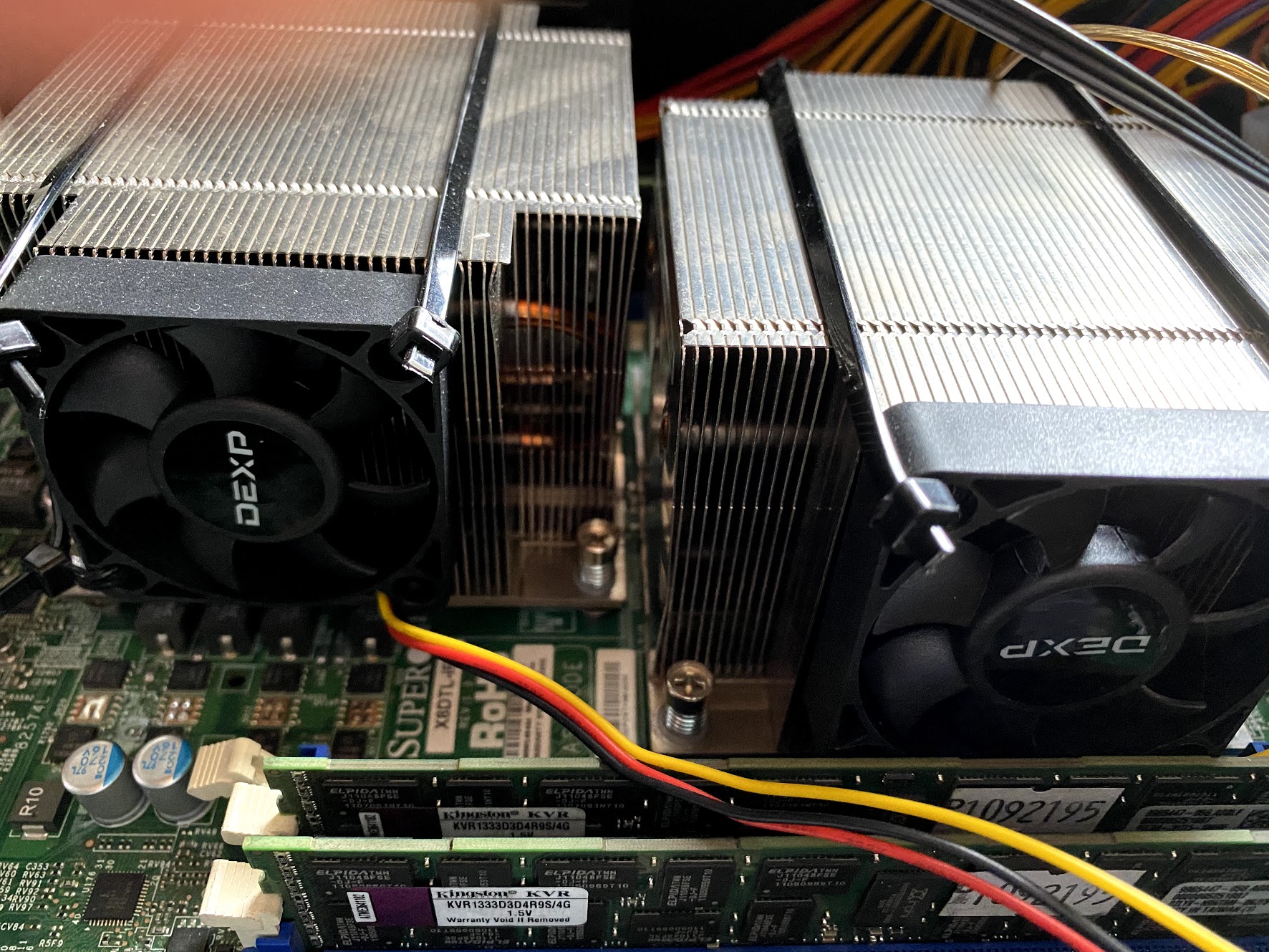 Помогите пожалуйста с не тривиальным охлаждением... Есть старая серверная материнка Supermicro x8dtl-if под сокет 1366. Сейчас стоят стоковые серверные радиаторы, а к ним на стяжках приделаны маленькие кулера. Колхоз дикий, но работает Нужно поставить что то более адекватное. Но смущает очень маленькое расстояние между сокетами - и как следствие между радиаторами. Я думал в сторону али - купить круглые переходные кольца и какие то простые кулера... P.S. Решение нужно максимально бюджетное - т.к. не факт что этот франкенштейн нужен будет в дальнейшем...