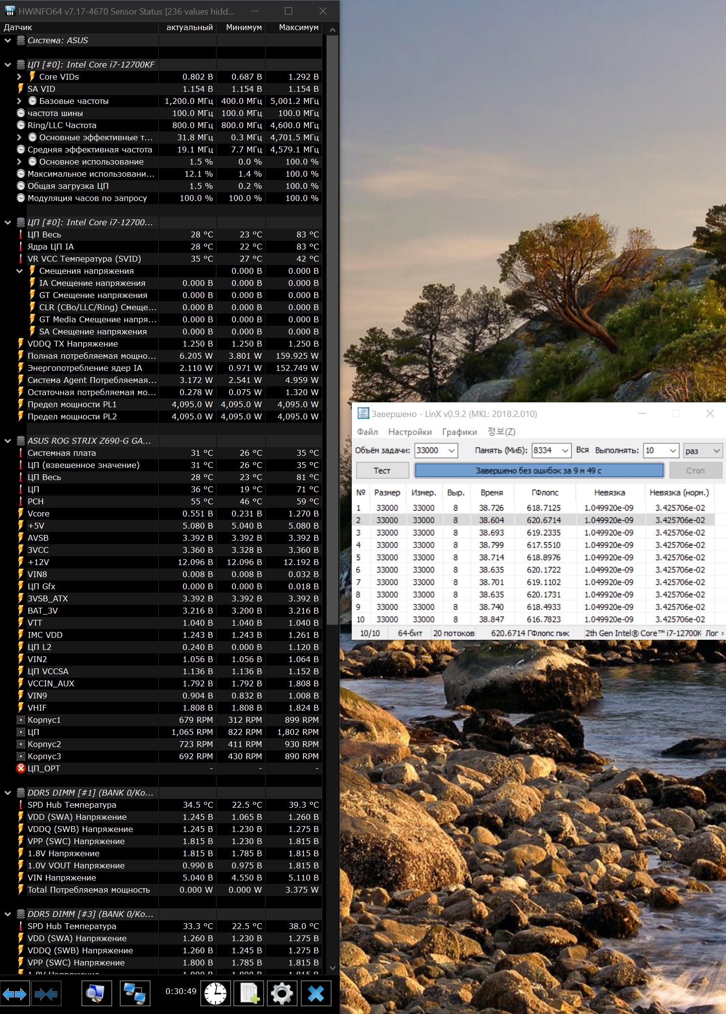 Тест LinX на 12000kf (без лимитов энергопотребления), кулер ID-Cooling SE-226-XT black со стоковой термопастой. Включено AI управление кулерами, поэтому процессор разогревался до 80-83 градусов, потом обороты вентилятора на кулере увеличивались до максимума, температура процессора падала до 52-53 градусов (!) и т.д. Похоже, что AI-система старалась держать температуру процессора не выше 80 гр. Можно было бы выключить AI, но лень. Корпус закрытый. В таблицу не попал кулер, подключенный к CPU_opt, т.е. в корпусе 2 вентилятора на вдув, 2 - на выдув. В помещении 23 градуса.