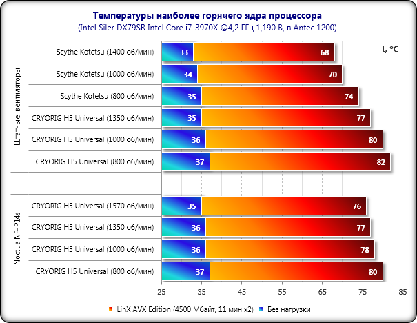 6700К, да еще обзор 4-х летней давности Уже Райзены с Кофейниками были. На будущее - БиКвайет делает хорошие радиаторы, но комплектные вентиляторы у них паршивые по производительности(зато тихие). Замена стокового вентиля у Дарк Рок 4 на TL-D14X позволила выиграть 5°C на всем диапазоне оборотов, хотя этот вентилятор "немного" великоватым смотрится. Но Архон он все равно не догнал А счастье было так возможно...
