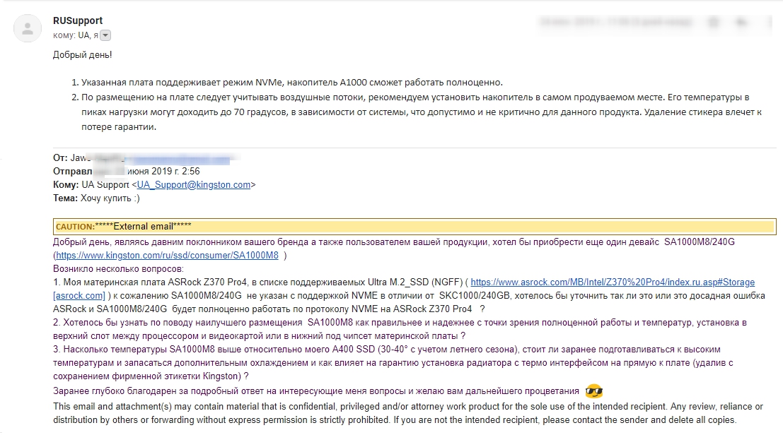 Всех приветствую, вижу в основном все обсуждают м.2 SSD от Samsung, а я вот глаз положил на м.2 KINGSTON A1000 (SA1000M8), может есть комрады которые уже юзают данный продукт, очень интересно где размещаете(верх низ) и как он по температурам голый и под радиком P.S. Если вдруг кому интересно, ответ от сапорта KINGSTON по поводу размещения, температур и гарантии на наклейке