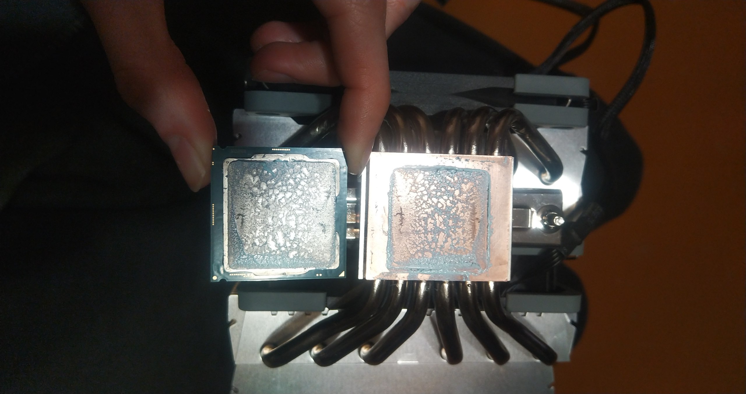 Всем привет! Имею fuma 2 в комбинации с 9600kf. Проблема в том, что кулер с трудом справляется с охлаждением этого процессора в разгоне. Пример: температура в комнате 22 градуса, на проце свежая mx-5. При частоте 4.9 и напряжении 1.4в (вентиляторы на макс. оборотах) температура самого горячего ядра в linx взлетает до 100 градусов, аида фиксирует троттлинг, тепловыделение процессора составляет 176 ватт. И разница между самым горячим и самым холодным ядром достигает 14 градусов, нормально ли это? Если верить обзорам кулер способен отводить 200 ватт тепла, мой же справляется максимум со 160... То есть линкс я могу пройти только на частоте 4.8 с напряжением на ядро 1.34, тогда температуры не переваливают за 90 и тдп около 160 вт. Также во время стресс-теста если дотронуться до ребер и теплотрубок кулера, на ощупь они еле теплые, складывается впечатление, что он не отрабатывает на полную. Очень хочется разобраться в чем проблема, в проце или в кулере, я склоняюсь ко второму, потому что он весь кривой и если присмотреться к его основанию, можно увидеть немаленький зазор между пластинами основания, куда запрессованы теплотрубки: