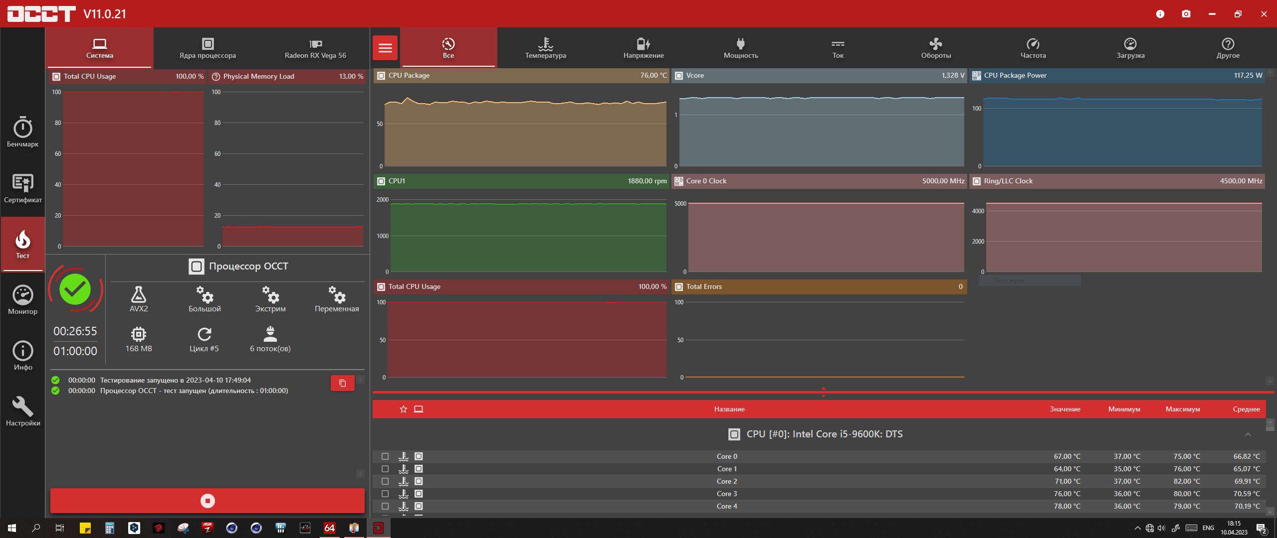 Температуры разогнанного до 5ГГЦ по всем ядрам i5 9600k с установленным SS135 ... термопаста с комплекта thermalright tf7) как оказалось не хуже хваленной МХ4... Осст температуру удерживает в пределах 75г. экстремальный пресет.... через пару минут темпа стабилизируется в этих пределах... и хоть на сутки оставляй больше не дает подняться, в Аиде тоже самое...FPU тест. Температура помещения 26 г. Даже с LinX 5ГГЦ худо бедно справляется... 80г...