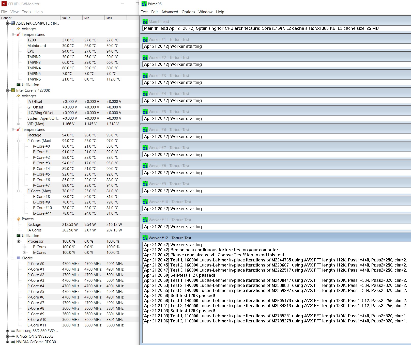 У японца же не всё так радостно. На стоковых напряжениях в Cinebench начинался троттлинг по P-ядрам. При снижении power limit до 175Вт и LLC до 1 температуры снижались, но не сказать, чтобы радикально, в пике доходили до 96 градусов. Хотя у него всего 23 градуса в комнате, у бразильца должно быть пожарче. Интересно, почему такая разница в 10 градусов? Неужели лишний вентилятор и открытый стенд у бразильца зарешали? Кому верить?