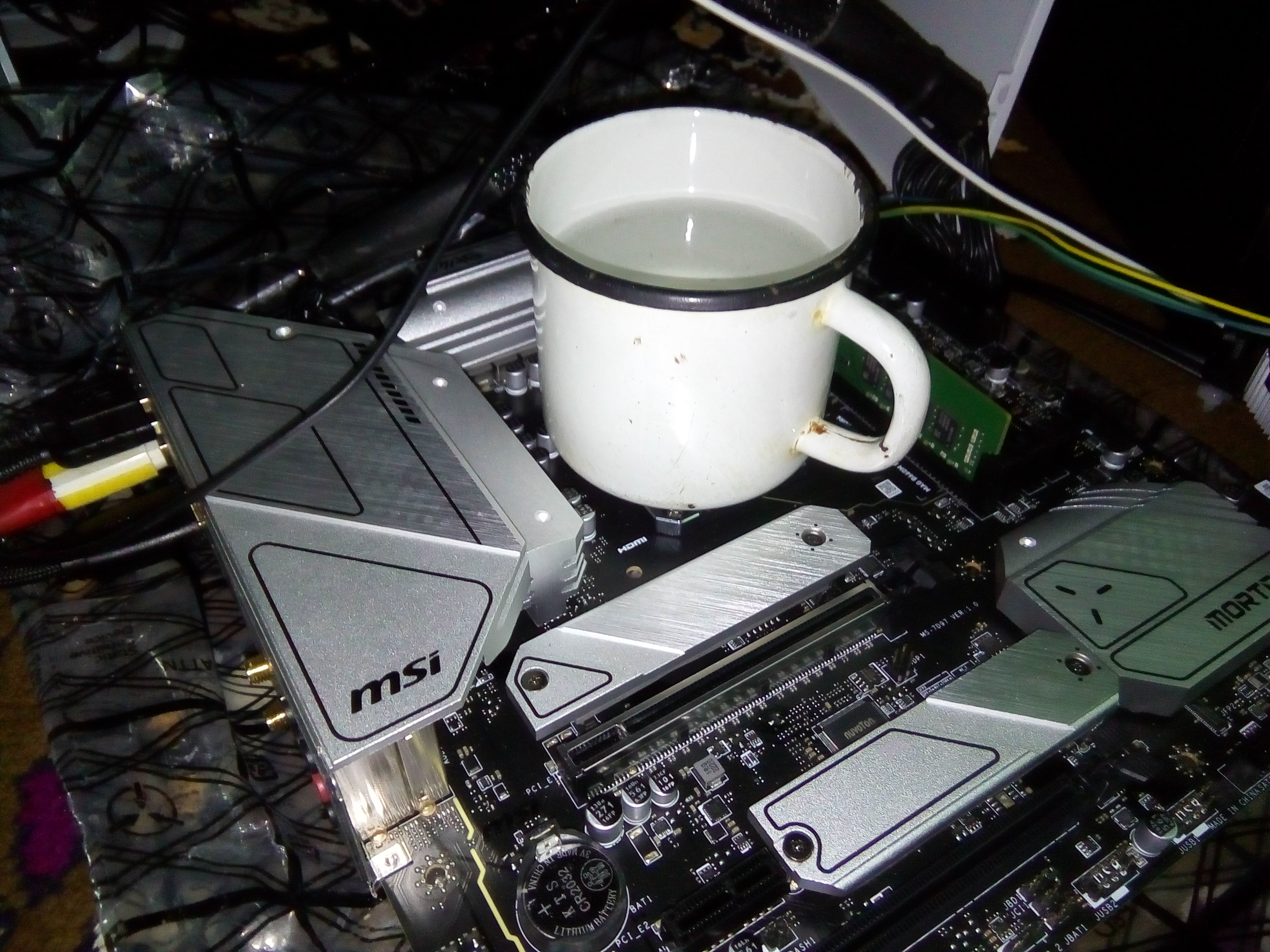 Значит решил дед собрать систему по частям: кулера еще нет, а проц с материнкой надо было проверить, не снимать же с рабочего компа, это долго) замутил водянку на минималках в кружке с водой, разве что вода не циркулирует как у рыбок в аквариуме, но они всю жизнь так живут и ничего а мне надо было полчаса всего) Оказалось стакану с водой вполне по силам охладить traxanie, хотя частоту на 12400 пришлось снизить до 2.5ггц при температуре в пределах 60, на 3.5 уже за 86 градусов улетает в простое. Термопасту на дно стакана не стал мазать, что наверное бы сбило градусов 20 ненадолго, т.к. пока ставил винду вода за 20 мин из ледяной прогрелась до в меру горячего чая. Кружку сверху накрывал капроновой крышкой как бабушкин компот после вскрытия, так что шанс мексиканского разлива был минимален)