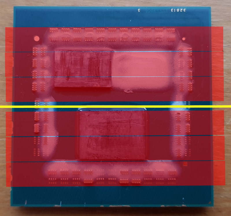 Вы автоген видели ? Так вот, одночиплетные Райзены так же сильно и точечно прогревают теплораспределительную крышку. В случае с CR-2100 у вас вообще может работать только 3 трубки из 6-ти. Во время теста в Прайм95, когда процессор прогревался до 90-94С, сокетное пространство с обратной стороны прогревалось до 60-65С. А с некоторыми СО до 72С. Охлаждение Райзенов - это скорость теплообмена. У меня сокет сильнее всего был поврежден именно в месте под чиплетом (CCD).